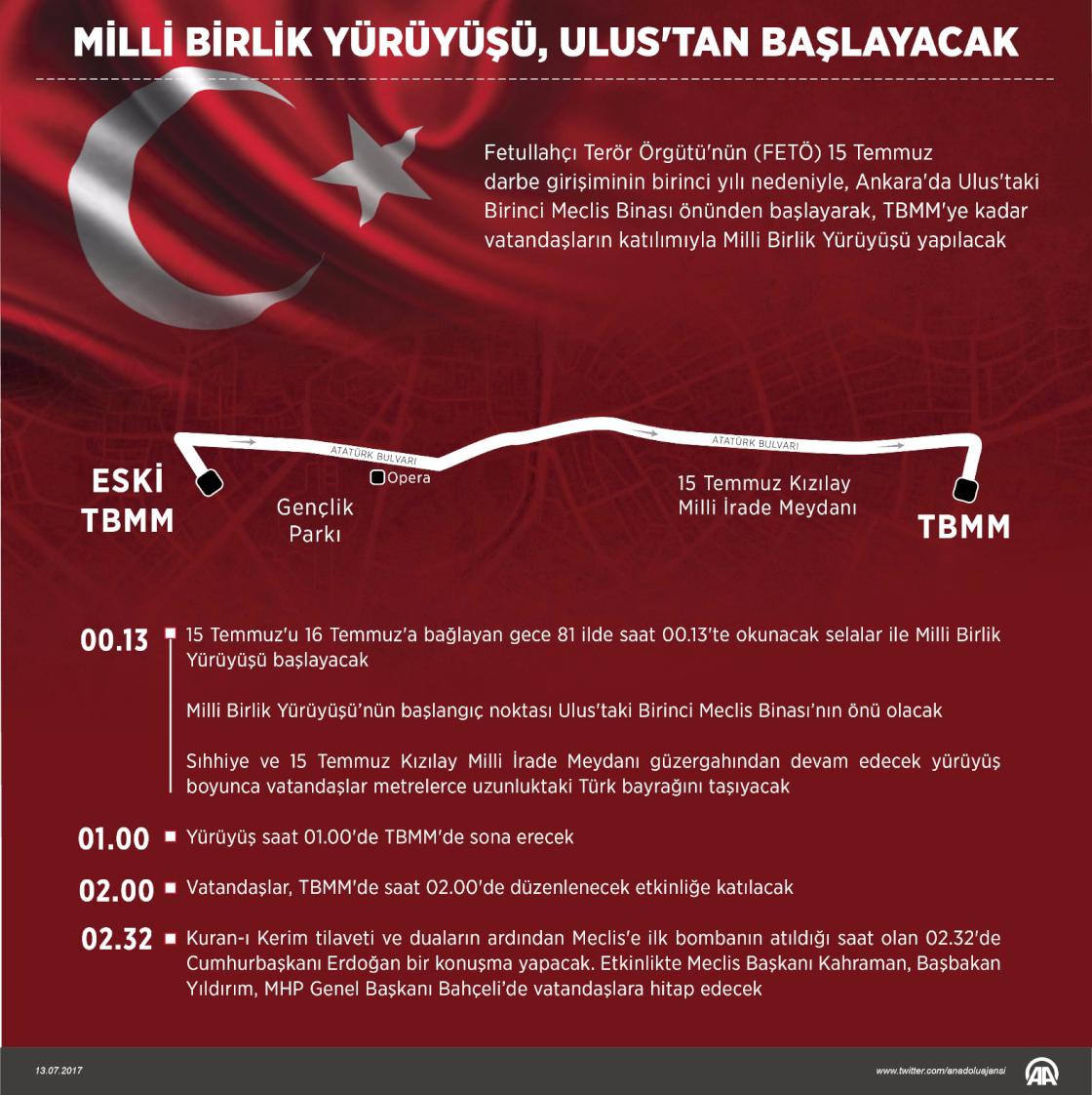 FETÖ'nün darbe girişiminin birinci yılı dolayısıyla düzenlenecek yürüyüş, Ankara Ulus'taki Birinci Meclis binası önünden başlayacak.