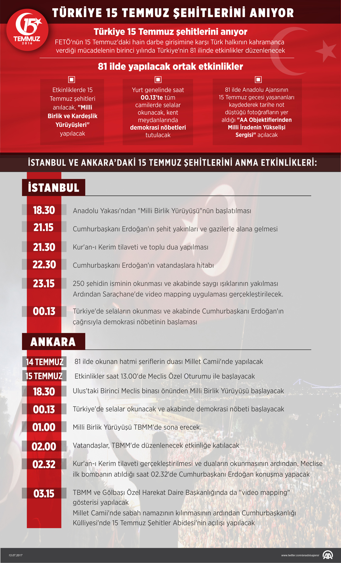 Türkiye'nin milli birlik ve beraberliğini hedef alan Fetullahçı Terör Örgütü'nün (FETÖ) 15 Temmuz 2016'daki hain darbe girişimine karşı Türk halkının kahramanca verdiği mücadelenin birinci yılında 81 ilde programlar düzenlenecek.