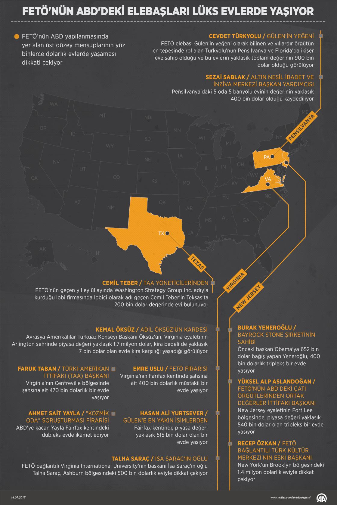Türkiye'de 15 Temmuz darbe girişimi öncesi veya sonrasında ABD'ye kaçan Fetullahçı Terör Örgütü'nün (FETÖ) üst düzey üyeleri, lüks evlerde sefa sürüyor.