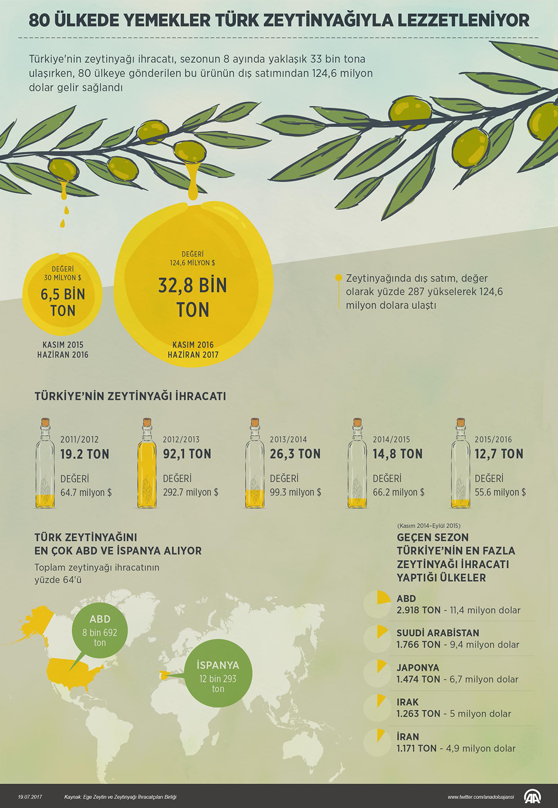 Türkiye'nin zeytinyağı ihracatı, sezonun 8 ayında yaklaşık 33 bin tona ulaşırken, 80 ülkeye gönderilen bu ürünün dış satımından 124,6 milyon dolar gelir sağlandı.