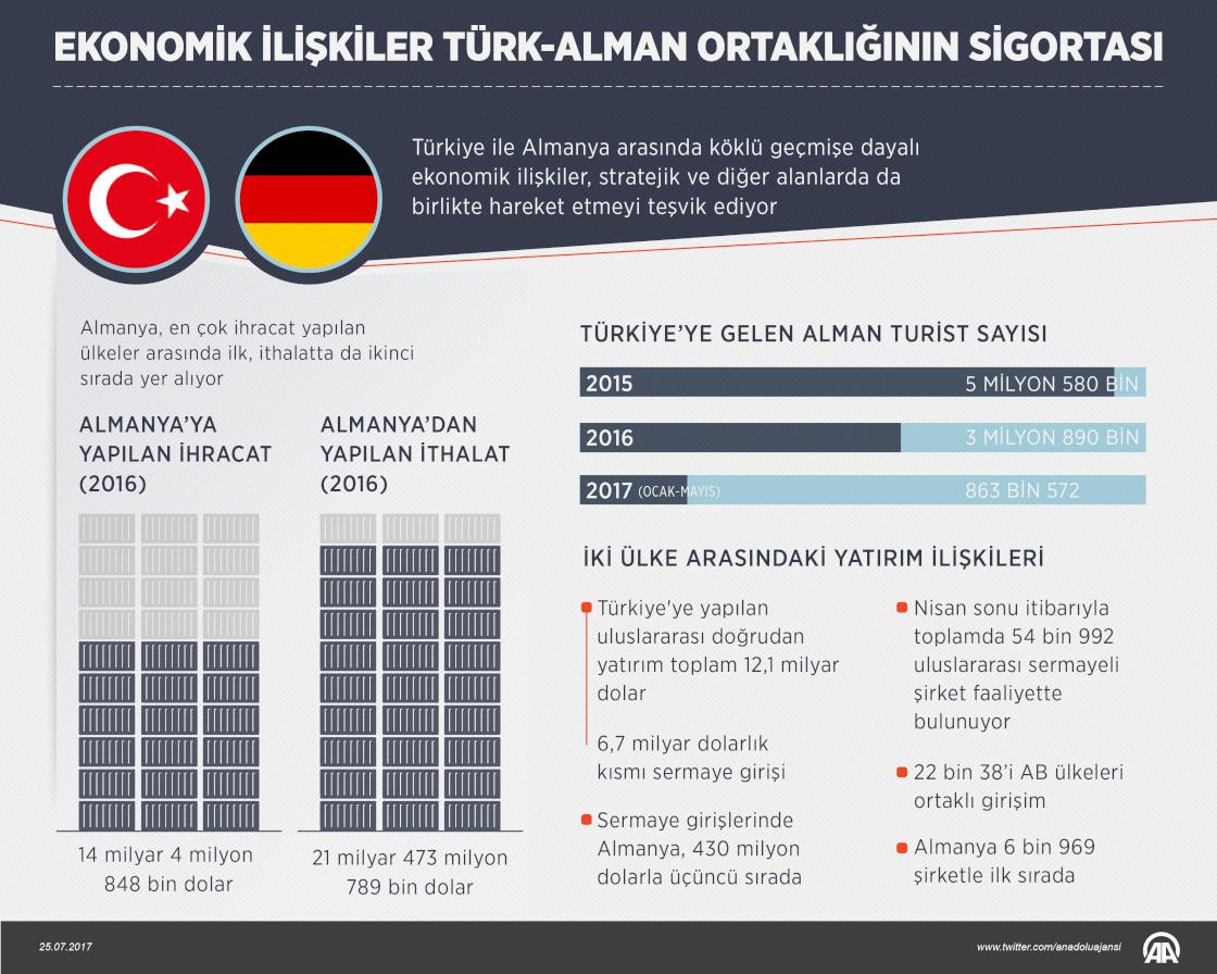 Türkiye ile Almanya arasında köklü geçmişe dayalı ekonomik ilişkiler, stratejik ve diğer alanlarda da birlikte hareket etmeyi teşvik ediyor. Almanya, en çok ihracat yapılan ülkeler arasında ilk, ithalatta ikinci sırada yer alıyor, geçen yıl Almanya'ya yapılan ihracat 2016'da 14,4 milyar dolar, ithalat 21,5 milyar dolar olarak gerçekleşirken, 3,9 milyon Alman vatandaşı Türkiye'yi ziyaret etti. ( Yasin Demirci - Anadolu Ajansı )25 Temmuz 2017•Güncelleme: 25 Temmuz 2017