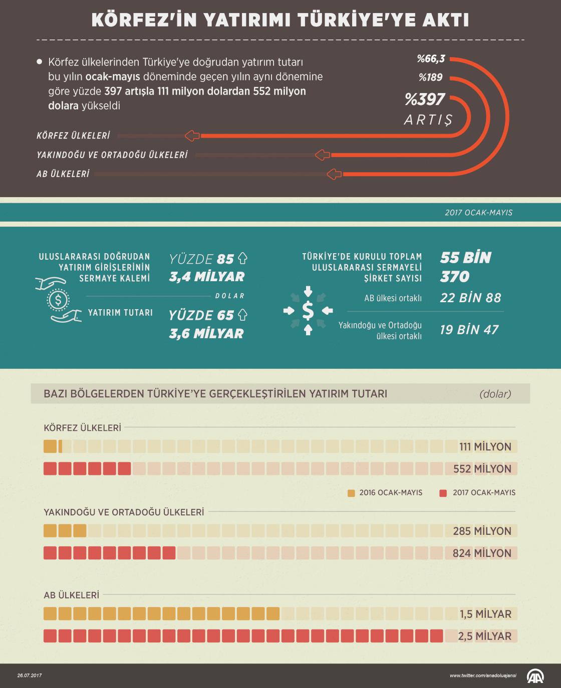 Ekonomi Bakanlığı verilerinden yapılan derlemeye göre, ekonomideki olumlu gidişat, hükümetin tedbir ve teşvikleri, AB ülkelerinin yanı sıra Körfez, Yakındoğu ve Ortadoğu ülkelerinin Türkiye'ye ilgisini de artırdı. Körfez ülkelerinden Türkiye'ye doğrudan yatırım tutarı bu yılın ocak-mayıs döneminde geçen yılın aynı dönemine göre yüzde 397 artışla 111 milyon dolardan 552 milyon dolara yükseldi. Söz konusu dönemde Yakındoğu ve Ortadoğu ülkelerinden Türkiye'ye gelen yatırım tutarı yüzde 189 artarak 285 milyon dolardan 824 milyon dolara ulaştı. Bu yılın ilk 5 ayında uluslararası doğrudan yatırım girişlerinin sermaye kalemi yüzde 85 yükselişle 3,4 milyar dolara, yatırım tutarı ise yüzde 65 artışla 3,6 milyar dolara çıktı. ( Ahmet Burak Özkan - Anadolu Ajansı )26 Temmuz 2017•Güncelleme: 26 Temmuz 2017