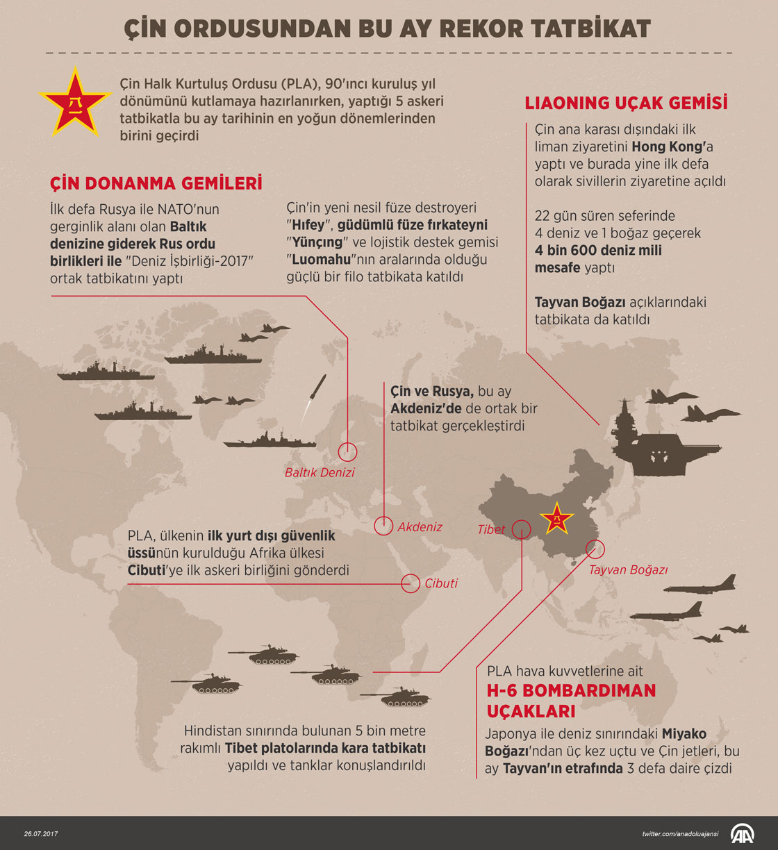 Çin Halk Kurtuluş Ordusu (PLA), 90'ıncı kuruluş yıl dönümünü kutlamaya hazırlanırken, yaptığı 5 askeri tatbikatla bu ay tarihinin en yoğun dönemlerinden birini geçirdi. ( Murat Usubaliev - Anadolu Ajansı )