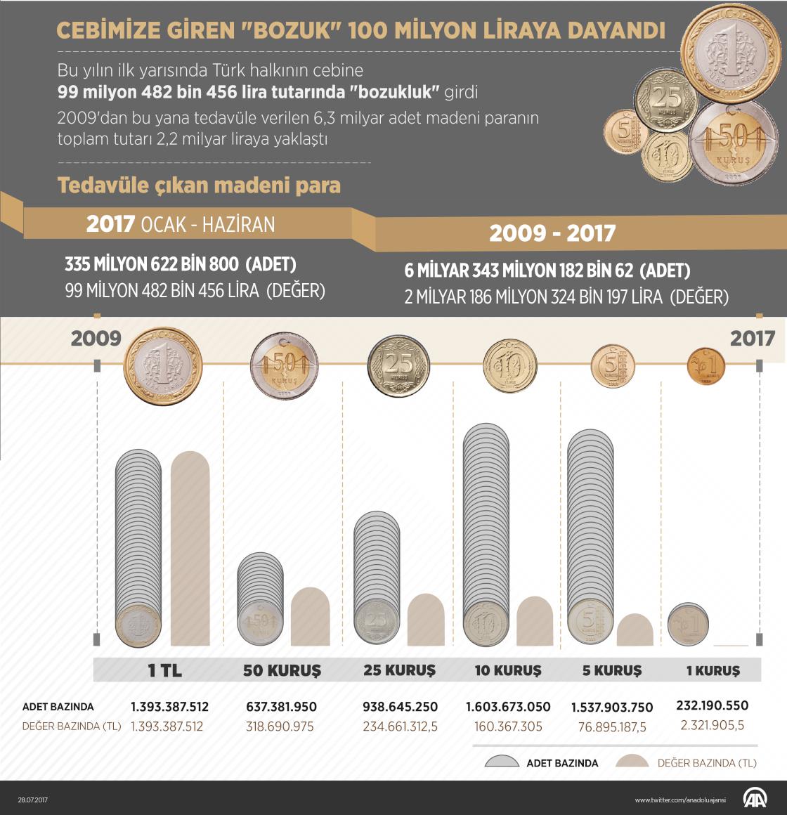Bu yılın ilk yarısında Türk halkının cebine 99 milyon 482 bin 456 lira tutarında "bozukluk" girdi. 2009'dan bu yana tedavüle verilen 6,3 milyar adet madeni paranın toplam tutarı 2,2 milyar liraya yaklaştı. Tedavüle verilen madeni paralar arasında piyasada en çok 1 milyar 603 milyon 673 bin 050 adet ile 10 kuruş bulunuyor. ( Gözde Gültekinler - Anadolu Ajansı )28 Temmuz 2017•Güncelleme: 28 Temmuz 2017
