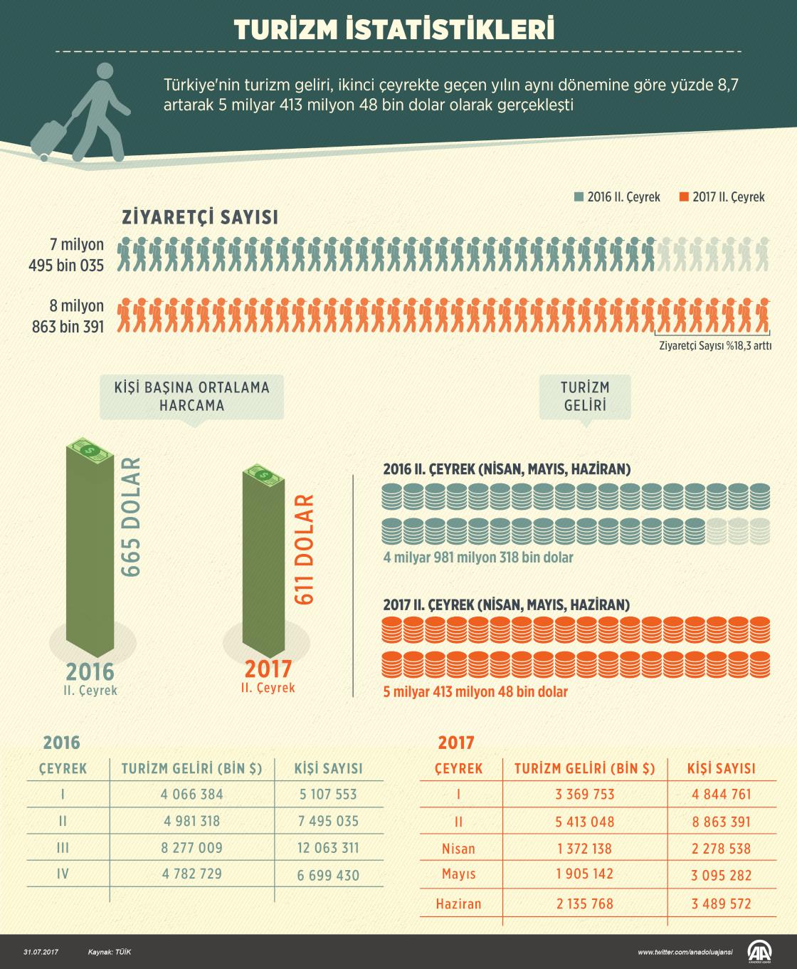 Türkiye İstatistik Kurumu (TÜİK), yılın ikinci çeyreğine ilişkin turizm istatistiklerini açıkladı. Buna göre, turizm geliri ikinci çeyrekte geçen yılın aynı dönemine göre yüzde 8,7 arttı ve 5 milyar 413 milyon 48 bin dolara yükseldi. Turizm gelirinin (cep telefonu dolaşım ve marina hizmet harcamaları hariç) yüzde 81,3'ü yabancı ziyaretçilerden, yüzde 18,7'si ise yurt dışında ikamet eden vatandaş ziyaretçilerden elde edildi.