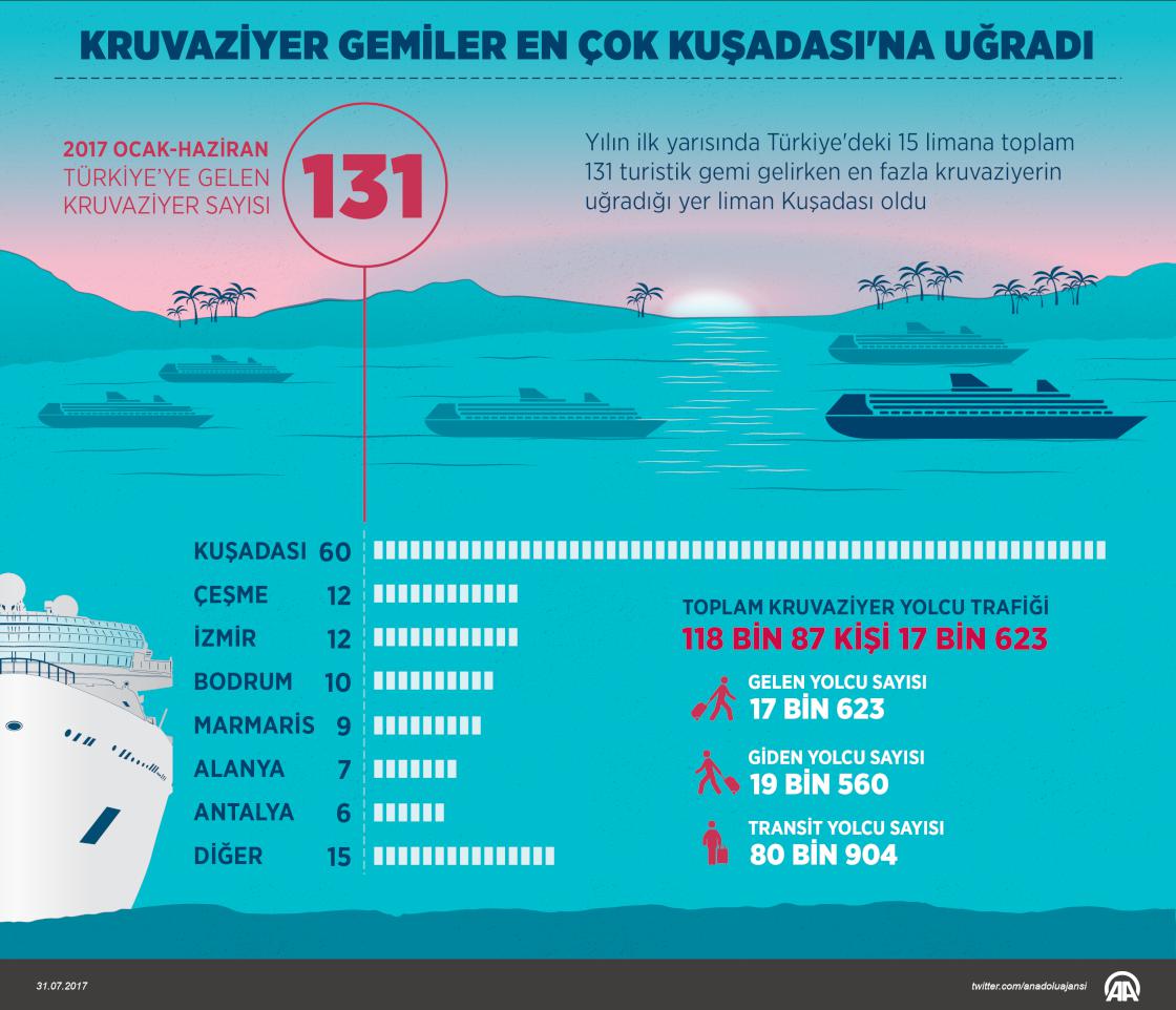 Türkiye'nin kruvaziyer yolcu trafiği yılın ilk yarısında 118 bin 87 kişi olurken yolcu gemileri en fazla Kuşadası Limanı'na uğradı. ( Murat Usubaliev - Anadolu Ajansı )
