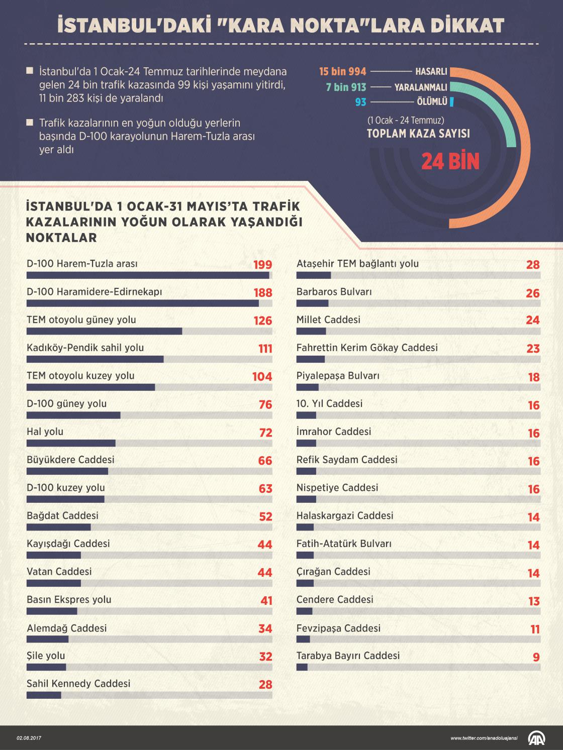Kentte, 1 Ocak-24 Temmuz tarihlerinde 15 bin 994'ü hasarlı, 7 bin 913'ü yaralanmalı ve 93'ü ölümlü olmak üzere 24 bin trafik kazası meydana geldi. Bu kazalarda 99 kişi yaşamını yitirdi, 11 bin 283 kişi de yaralandı. İstanbul Emniyet Müdürlüğünce "kara nokta"ların tespit edildiği çalışmada, trafik kazalarının en yoğun olduğu yerlerin başında D-100 karayolunun Harem-Tuzla arası yer alırken, bunu D-100 karayolunun Haramidere-Edirnekapı arası ile TEM otoyolunun güney yolu takip etti. Emniyet yetkilileri, sürücüleri trafik kurallarına uymaları, özellikle aşırı hız ve hatalı sollama yapmamaları, emniyet kemerini takmaları konusunda uyardı. ( Muhammed Ali Yiğit - Anadolu Ajansı )02 Ağustos 2017•Güncelleme: 02 Ağustos 2017
