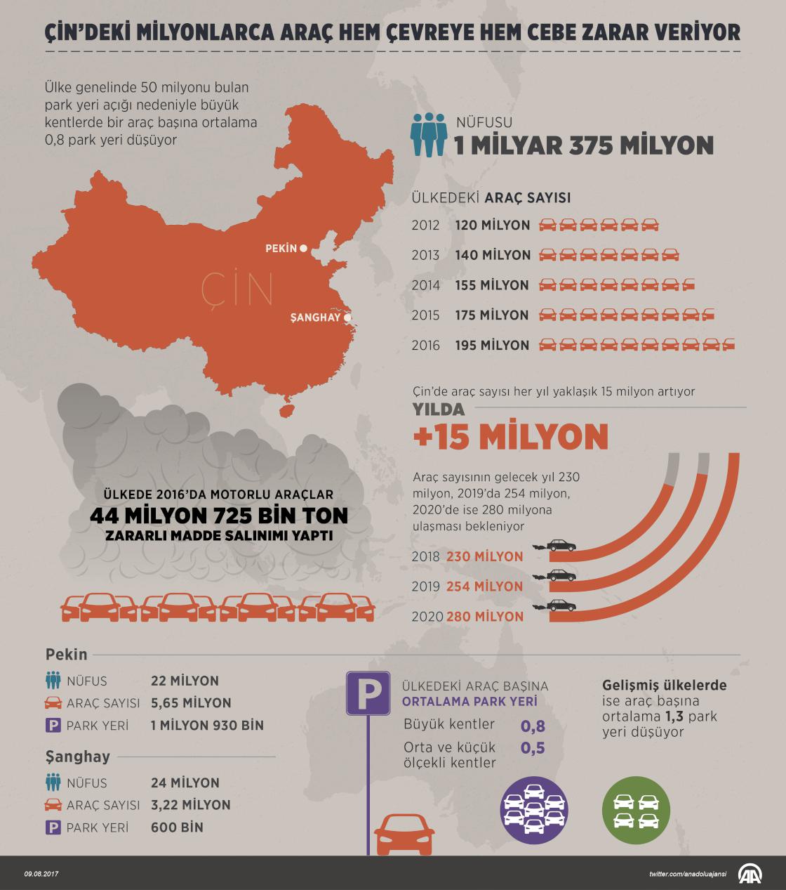 Dünyanın en büyük otomotiv pazarı Çin’de her yıl trafiğe eklenen ortalama 15 milyon araç saldığı milyonlarca ton karbonla havayı kirletirken, büyük şehirlerde halk aracını park edecek yer bulmak için milyarlarca dolar harcıyor. Nüfusu 1 milyar 375 milyonu bulan Çin’de araç sayısı giderek artıyor. Çin Ulusal Kalkınma ve Reform Komisyonunun yayımladığı rapora göre, son beş yılda araç sayısı 120 milyondan 195 milyona ulaştı. Ülkede, 2012’de 120 milyon olan araç sayısı, 2013’te 140 milyon, 2014’te 155 milyon, 2015’te 175 milyon, 2016’da 195 milyona yükseldi. ( Murat Usubaliev - Anadolu Ajansı )09 Ağustos 2017•Güncelleme: 09 Ağustos 2017