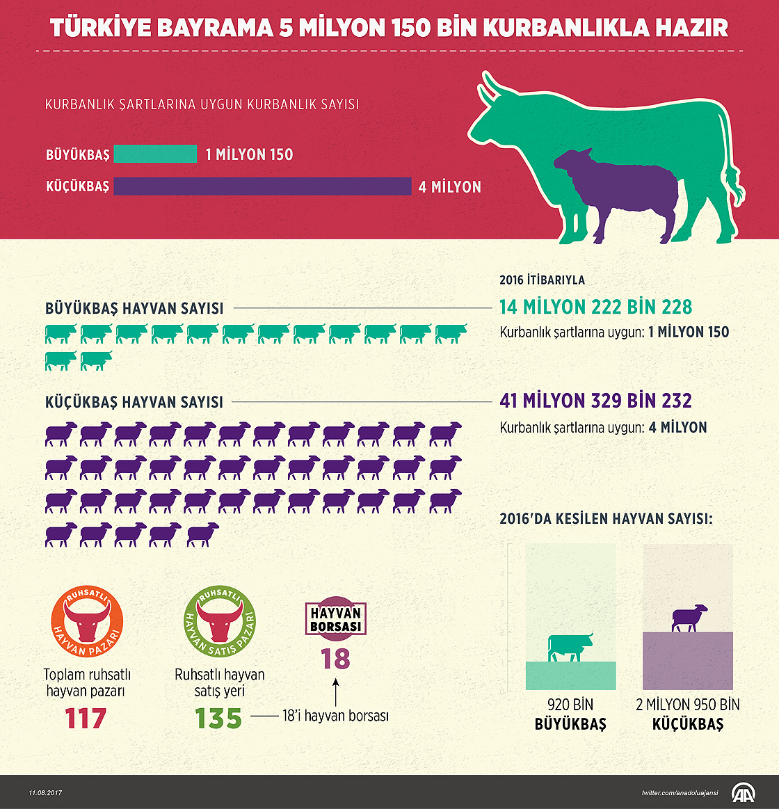 Türkiye'de kurbanlık şartlarına uygun 1 milyon 150 bin büyükbaş, 4 milyon küçükbaş bulunuyor.