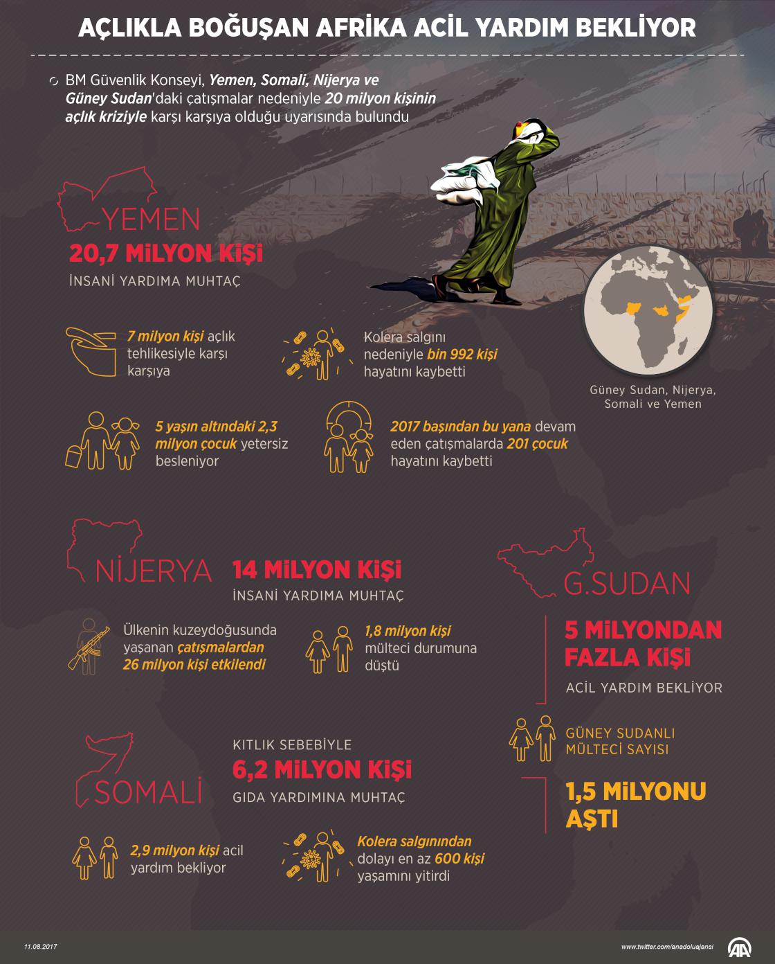 BM Güvenlik Konseyi, Yemen, Somali, Nijerya ve Güney Sudan'daki çatışmalar nedeniyle 20 milyon kişinin açlık kriziyle karşı karşıya olduğu uyarısında bulundu. Yemen'de 7 milyon kişi açlık tehlikesiyle karşı karşıya kalırken, 5 yaşın altındaki 2,3 milyon çocuk da yetersiz besleniyor. 1945'ten bu yana en şiddetli kuraklığın yaşandığı Somali'de, 6,2 milyon kişi gıda yardımına, 2,9 milyon kişi acil yardıma ihtiyaç duyuyor. Afrikanın en kalabalık ülkesi Nijerya'da 14 milyon kişi yardıma muhtaç. Güney Sudan’da ise iç çatışmalar ve kuraklığın etkisiyle yaşanan kıtlık ve açlık krizi nedeniyle 5 milyondan fazla kişi acil yardım bekliyor. ( Ahmet Burak Özkan - Anadolu Ajansı )11 Ağustos 2017•Güncelleme: 11 Ağustos 2017