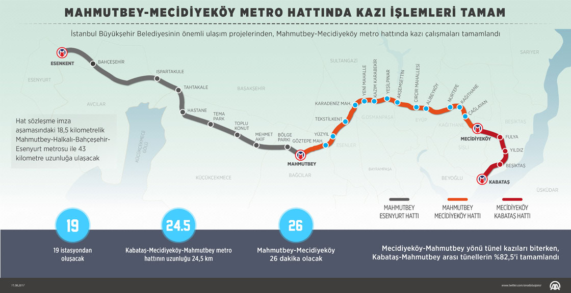 İstanbul Büyükşehir Belediyesinin önemli ulaşım projelerinden, Mahmutbey-Mecidiyeköy metro hattında kazı çalışmaları tamamlandı. Grafik: AA/Mevlüt Eren