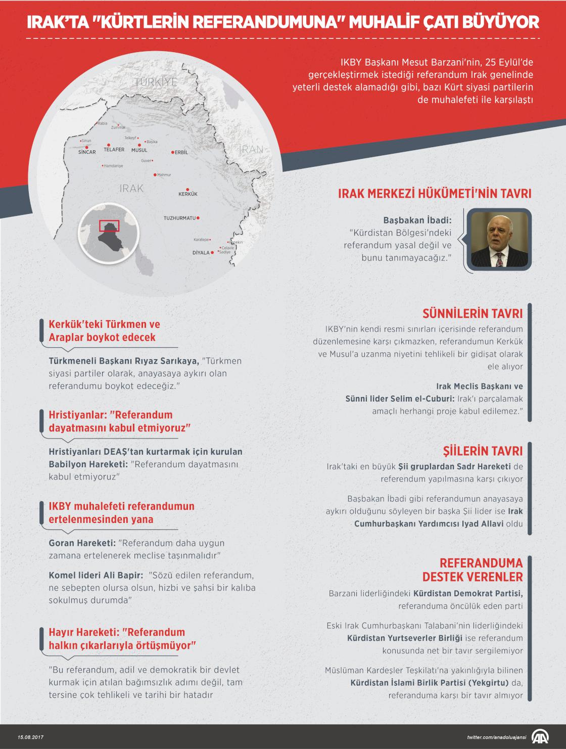 Irak Kürt Bölgesel Yönetimi (IKBY) Başkanı Mesut Barzani'nin, 25 Eylül'de gerçekleştirmek istediği referandum Irak genelinde yeterli destek alamadığı gibi bazı Kürt siyasi partilerin de muhalefeti ile karşılaştı .IKBY'nin tek taraflı kararıyla yapılması öngörülen referanduma, Irak merkezi hükümeti başta olmak üzere Kerkük'teki Türkmenler, Musul'daki Arap ve bazı Hristiyanlar şiddetle karşı çıkarken, muhalefetin başını çeken Goran (Değişim) Hareketi ve Kürdistan İslami Toplum Partisi (Komel) de güçlü bir konsensüs sağlanmadığı ve karar meclis çatısı altında alınmadığı için referandumun uygun olmadığı üzerinde duruyorlar. ( Yasin Demirci - Anadolu Ajansı )15 Ağustos 2017•Güncelleme: 15 Ağustos 2017