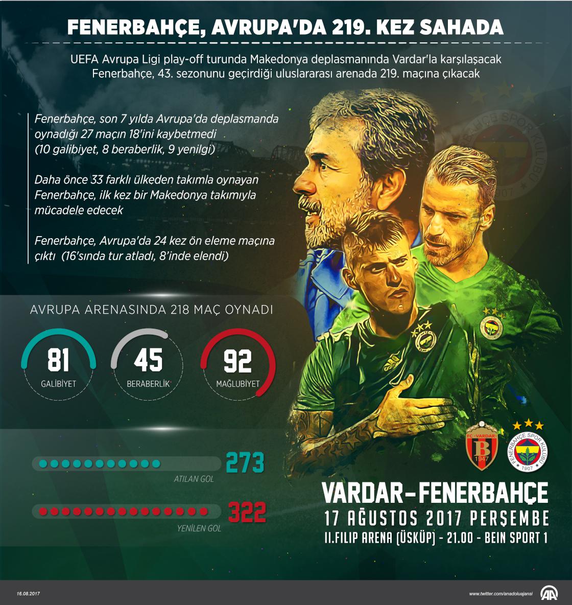 UEFA Avrupa Ligi play-off turunda yarın Makedonya deplasmanında Vardar'la karşılaşacak Fenerbahçe, 43. sezonunu geçirdiği uluslararası arenada 219. maçına çıkacak. Avusturya temsilcisi Sturm Graz'ı eleyerek play-off turuna kalan sarı-lacivertliler, Avrupa arenasında bugüne kadar yaptığı 218 maçta 81 galibiyet, 45 beraberlik ve 92 mağlubiyet aldı. Bu maçlarda rakip filelere 273 gol gönderen Fenerbahçe, kalesinde ise 322 gol gördü. ( Kemal Delikmen - Anadolu Ajansı )16 Ağustos 2017•Güncelleme: 16 Ağustos 2017