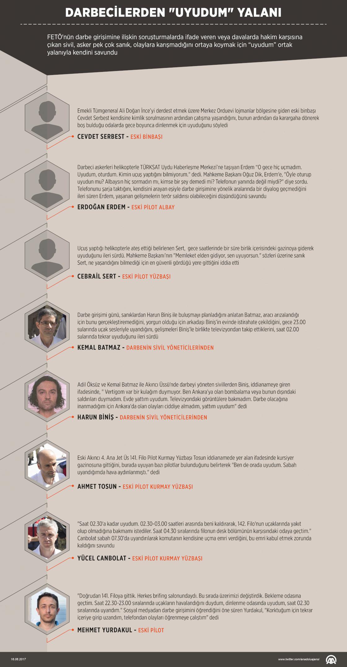 Fetullahçı Terör Örgütü'nün (FETÖ) darbe girişiminin sivil yöneticilerinden askerlere kadar birçok sanık, bombaların düştüğü, çatışmaların yaşandığı gece "uyudum" ortak yalanıyla kendisini savundu. FETÖ'nün darbe girişiminin ardından hazırlanan iddianamelerde ve yapılan yargılamalarda ifadeleri ortaya çıkan terör örgütü üyesi sanıkların, darbenin en hareketli saatlerini uyuyarak geçirdiği yönündeki beyanları, duruşmalarda mahkeme başkanlarının, avukatların ve izleyicilerin tepkisini çekti. ( Yasin Demirci - Anadolu Ajansı )16 Ağustos 2017•Güncelleme: 16 Ağustos 2017