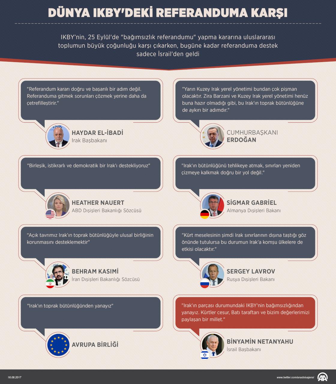 Irak Kürt Bölgesel Yönetiminin (IKBY), 25 Eylül'de "bağımsızlık referandumu" yapma kararına uluslararası toplumun büyük çoğunluğu karşı çıkarken, bugüne kadar referanduma destek sadece İsrail'den geldi. IKBY Başkanı Mesut Barzani'nin siyasi parti temsilcileriyle 7 Haziran'da Erbil'de yaptığı toplantıda, 25 Eylül'de bölgede bağımsızlık için referandum düzenleme kararı alındı. ( Yasin Demirci - Anadolu Ajansı )16 Ağustos 2017•Güncelleme: 16 Ağustos 2017
