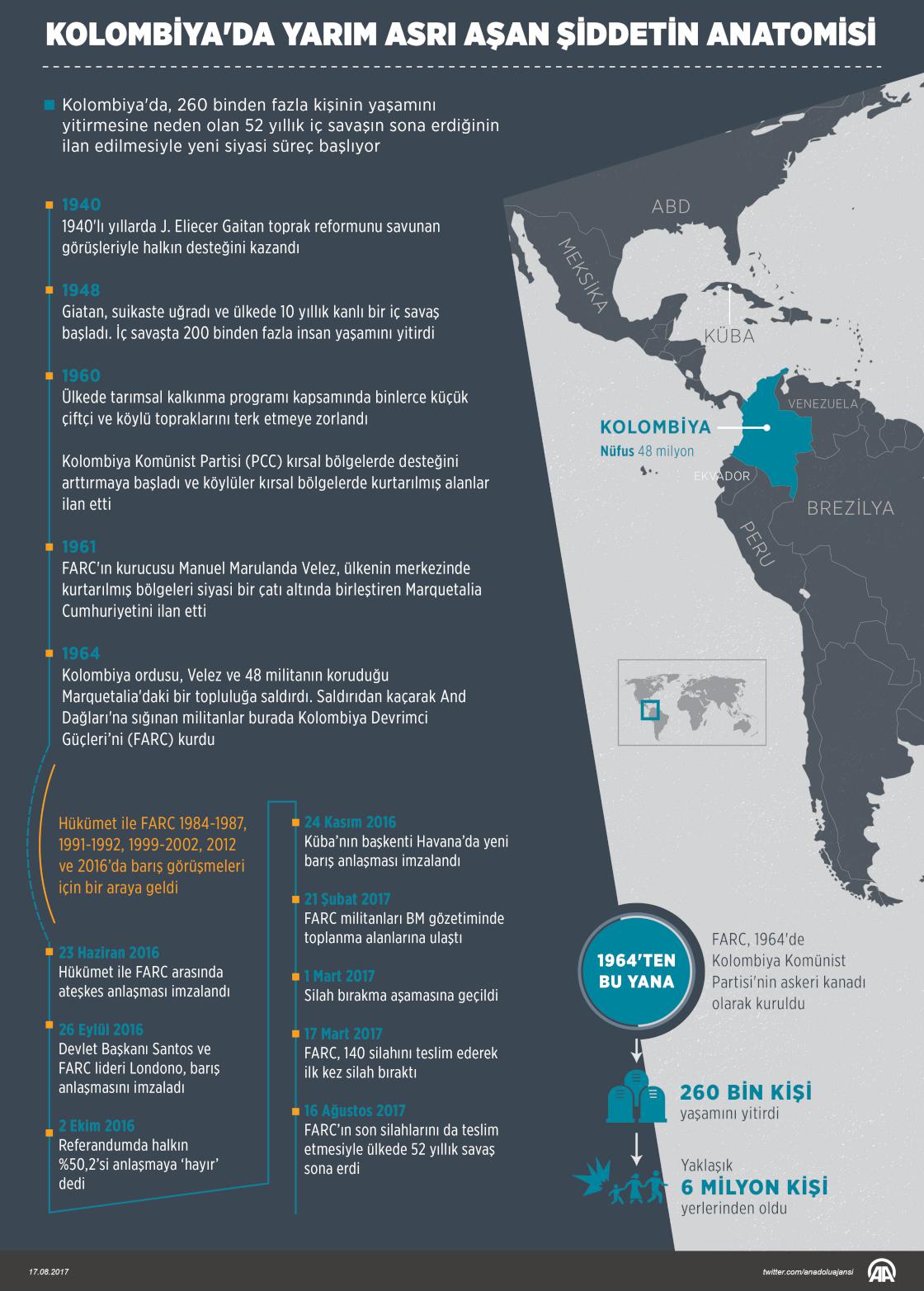 Kolombiya'da 53 yıllık savaşa nokta koyan silah bırakma süreci sona ererken, ülkede 260 binden fazla kişinin yaşamını yitirmesine neden olan silahlı çatışma ülkenin kuruluşuna kadar giden tarihsel sorunlara dayanıyor. ( Yasin Demirci - Anadolu Ajansı )17 Ağustos 2017•Güncelleme: 17 Ağustos 2017
