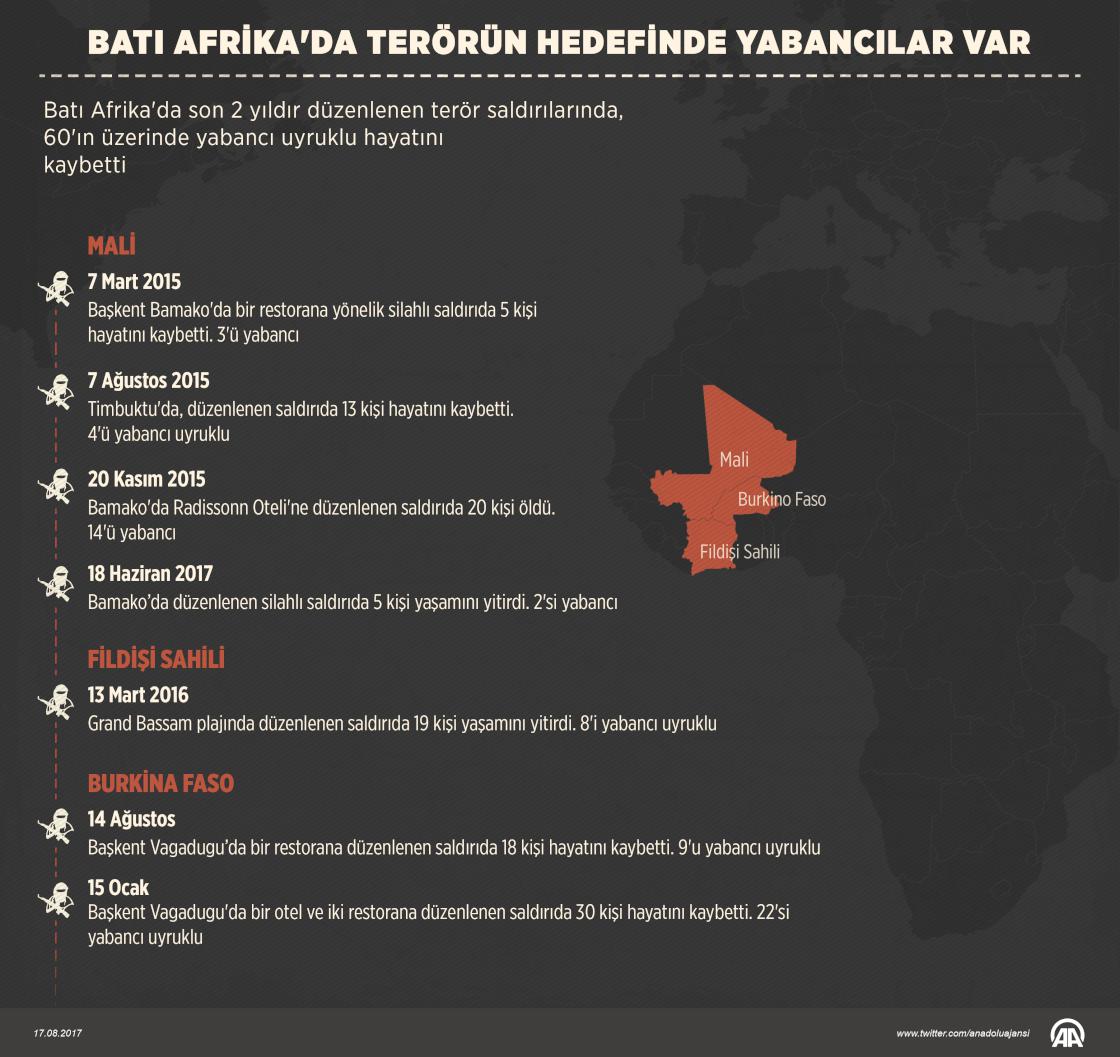 Burkina Faso'da hafta başında düzenlenen ve bir Türk vatandaşının hayatını kaybettiği terör saldırısı, akıllara Batı Afrika ülkelerinde son yıllarda yabancı uyrukluları hedef alan saldırıları getirdi. Başkent Vagadugu'nun merkezinde yabancıların sıkça bulunduğu şehir merkezinde düzenlenen saldırıda, resmi verilere göre yaşamını yitiren 18 kişiden 9'unu yabancı uyruklular oluşturuyor. ( Muhammed Ali Yiğit - Anadolu Ajansı )17 Ağustos 2017•Güncelleme: 17 Ağustos 2017