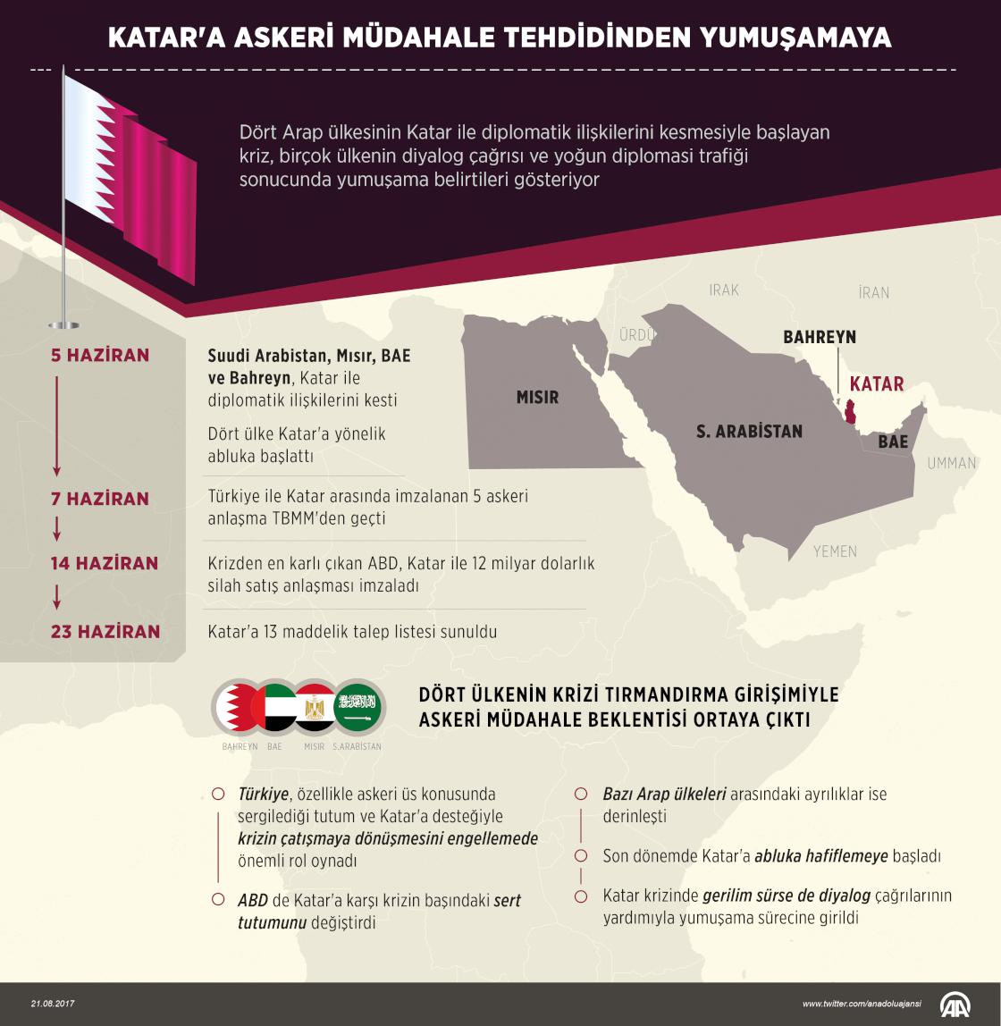 Dört Arap ülkesinin Katar ile diplomatik ilişkilerini kesmesiyle başlayan kriz, birçok ülkenin diyalog çağrısı ve yoğun diplomasi trafiği sonucunda yumuşama belirtileri gösteriyor. Suudi Arabistan, Mısır, BAE ve Bahreyn, Katar'a yönelik ablukaya başladı, şartlar öne sürerek müdahale beklentisi yarattı ancak krizi tırmandırma girişimleri sonuç vermedi. ( Ahmet Burak Özkan - Anadolu Ajansı )21 Ağustos 2017•Güncelleme: 21 Ağustos 2017