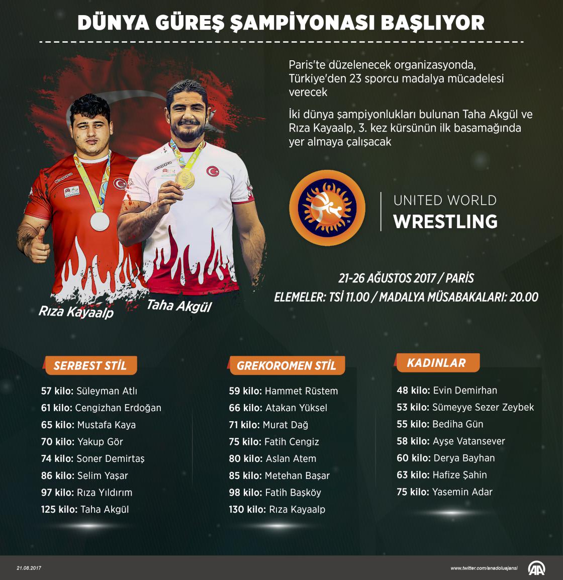 ünya Güreş Şampiyonası yarın Fransa'nın başkenti Paris'te başlayacak. Güreşte, olimpiyatlardan sonraki en önemli organizasyonda, erkekler serbest ve grekoromen stil ile kadınlarda sekizer sıklette müsabakalar yapılacak. ( Muhammed Ali Yiğit - Anadolu Ajansı )21 Ağustos 2017•Güncelleme: 21 Ağustos 2017