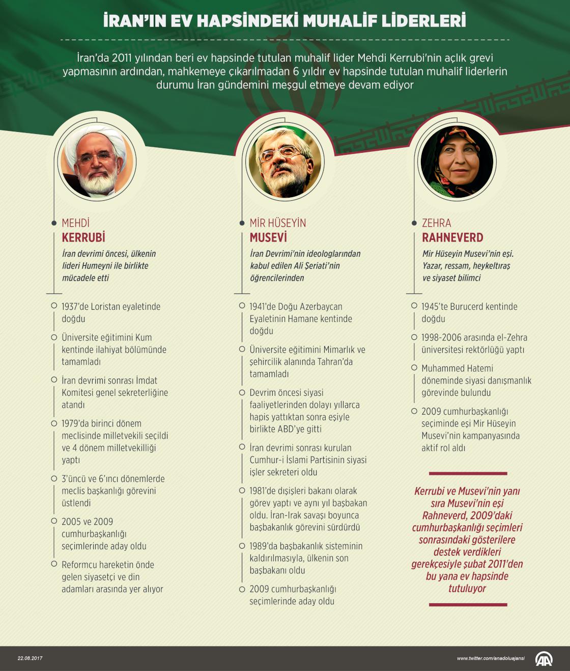 İran'da Kerrubi'nin açlık grevi, ülkede mahkemeye çıkarılmadan 6 yıldır ev hapsinde tutulan muhalif liderlerin durumunu yeniden gündeme getirdi. Kerrubi'nin yanı sıra reformist kanadın bir diğer önde gelen ismi Musevi ve eşi Rahneverd, 2009'daki cumhurbaşkanlığı seçimleri sonrasındaki gösterilere destek verdikleri gerekçesiyle ev hapsinde tutuluyor. ( Ahmet Burak Özkan - Anadolu Ajansı )22 Ağustos 2017•Güncelleme: 22 Ağustos 2017