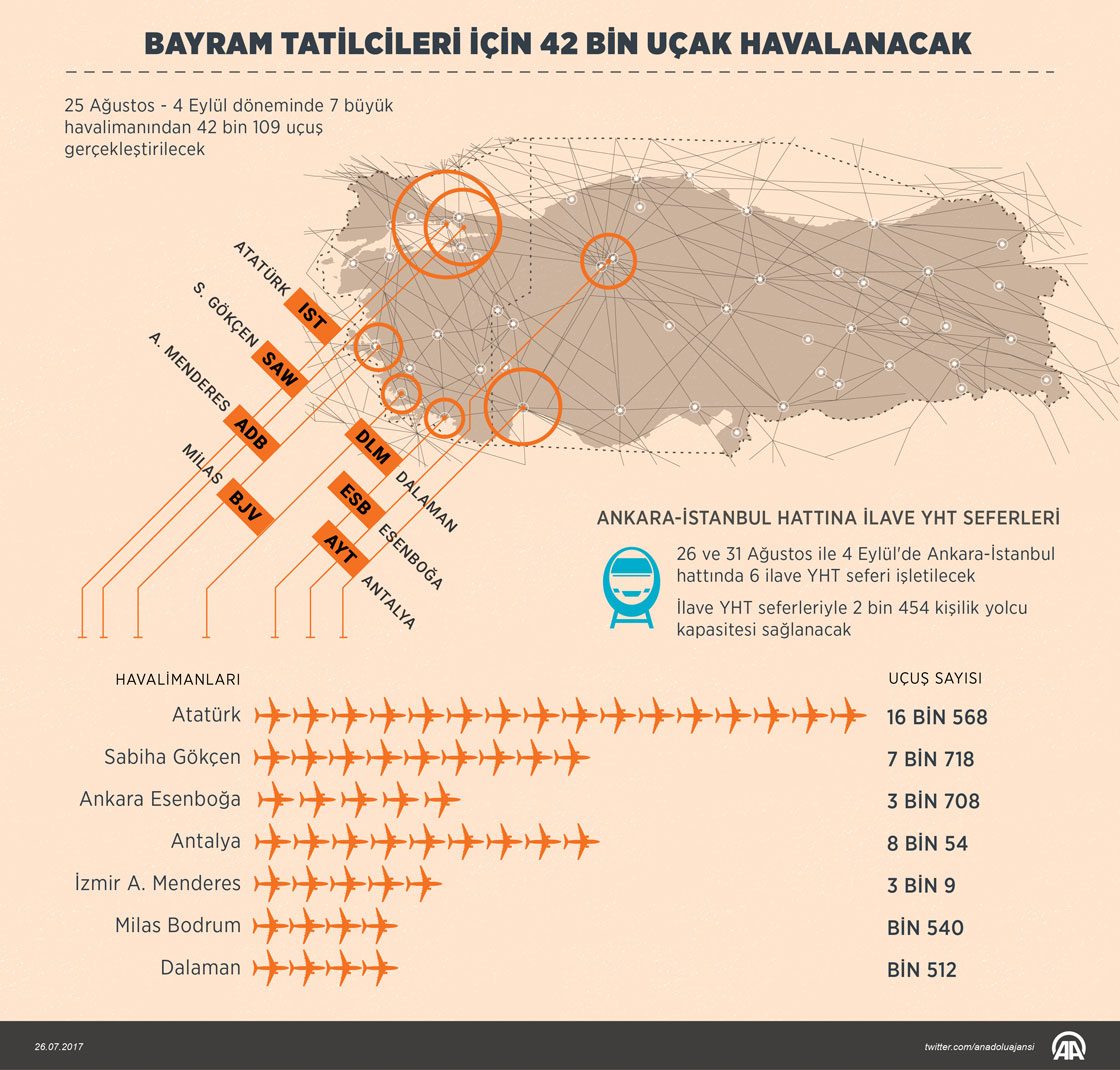 Ulaştırma, Denizcilik ve Haberleşme Bakanı Ahmet Arslan, Kurban Bayramı tatilinin 10 güne çıkarılması ve sezonun son tatili niteliğini taşıması nedeniyle yolların önceki yıllara göre daha kalabalık olmasını beklediklerini belirterek, "Havayolunu tercih eden vatandaşlarımız için 25 Ağustos-4 Eylül döneminde 7 büyük havalimanından 42 bin 109 uçuş gerçekleştirilecek." dedi. ( Murat Usubaliev - Anadolu Ajansı )22 Ağustos 2017•Güncelleme: 22 Ağustos 2017