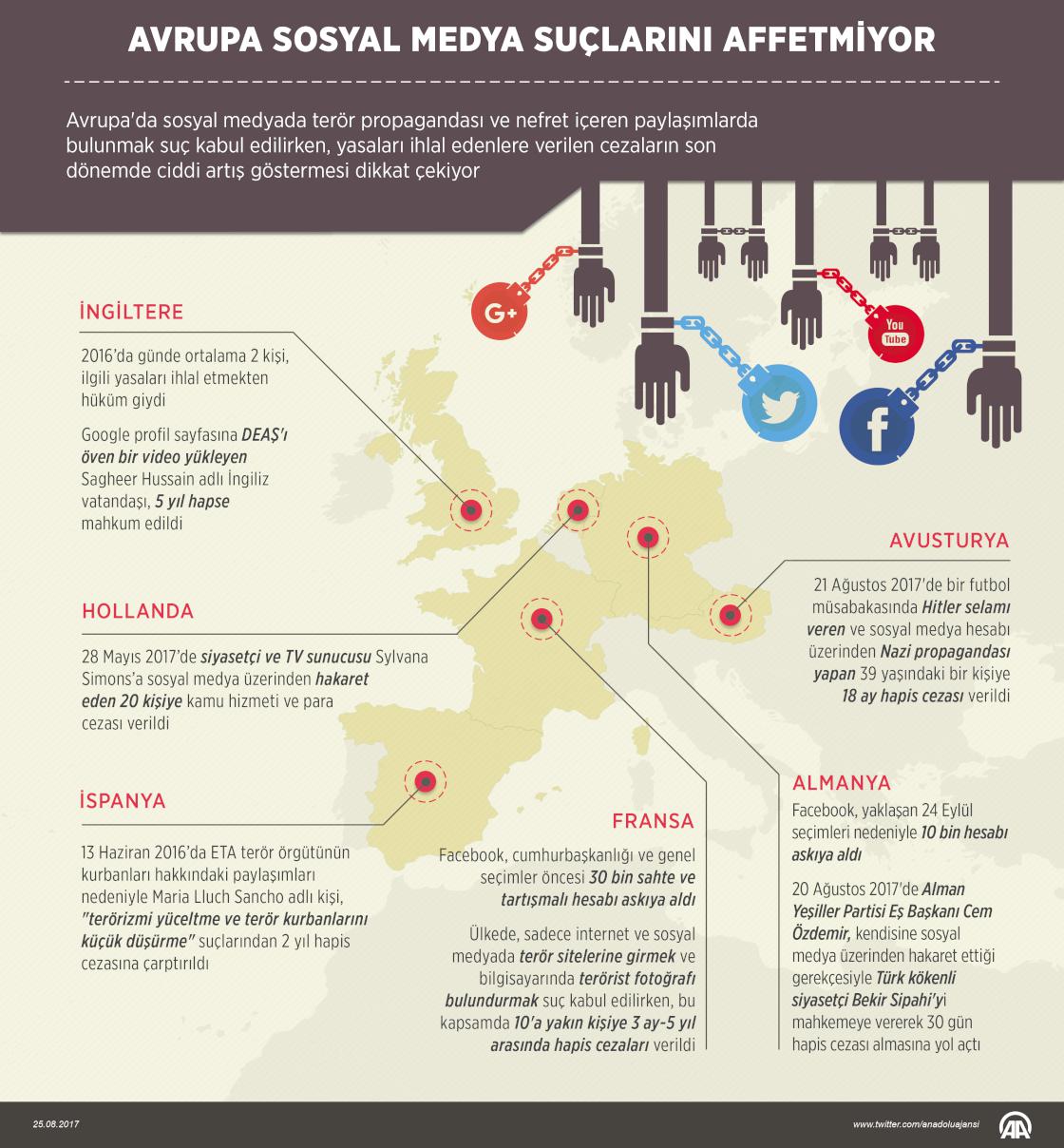 Avrupa'da sosyal medyada terör propagandası ve nefret içeren paylaşımlarda bulunmak suç kabul edilirken, yasaları ihlal edenlere verilen cezaların son dönemde ciddi artış göstermesi dikkati çekiyor. Avrupa ülkeleri, sosyal medyaya daha fazla denetim istiyor. Bu çerçevede, Avrupa Birliği (AB), Facebook ve Twitter gibi sosyal medya şirketlerinden gerekli durumlarda içeriğe müdahale edebilecek araçlar geliştirmesini istedi. ( Ahmet Burak Özkan - Anadolu Ajansı )25 Ağustos 2017•Güncelleme: 25 Ağustos 2017