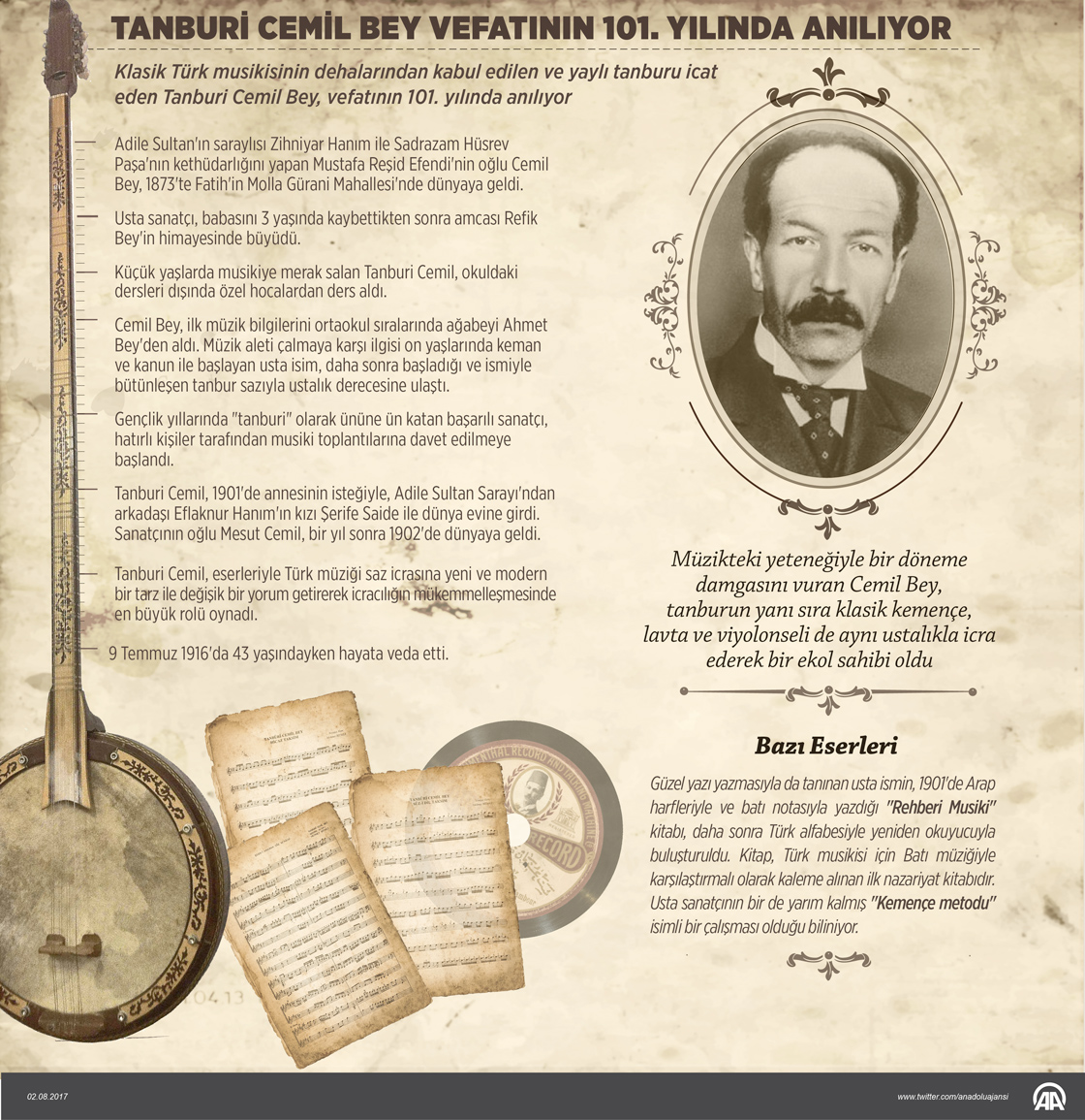 Klasik Türk musikisinin dehalarından kabul edilen ve yaylı tanburu icat eden Tanburi Cemil Bey, vefatının 101. yılında anılıyor.