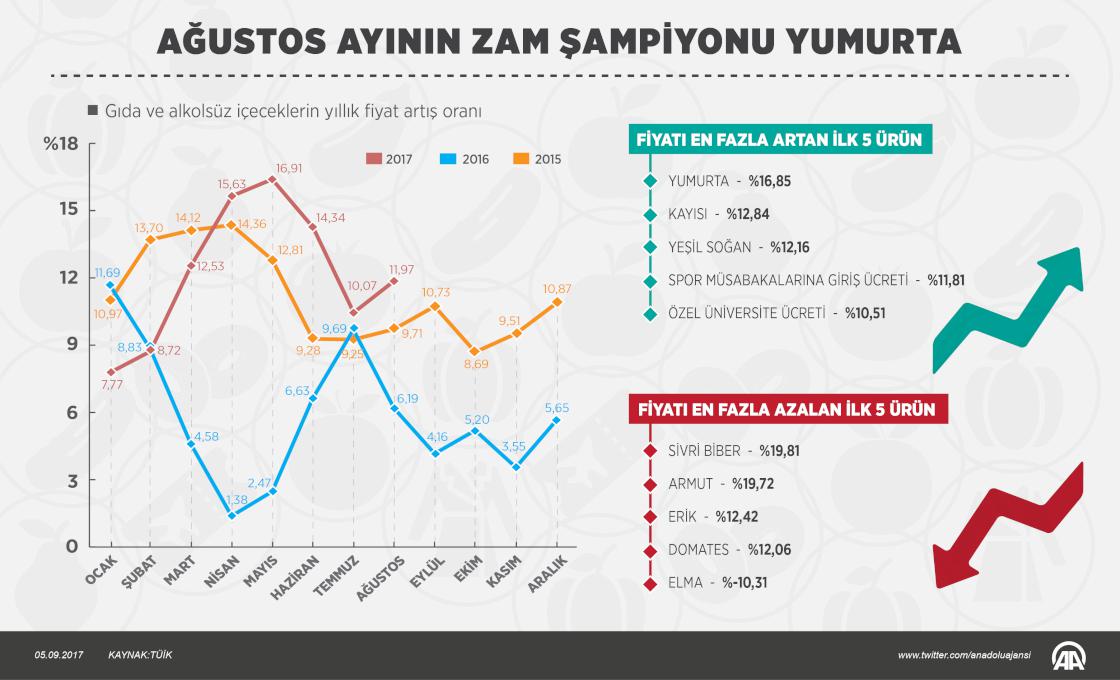 Tüketici fiyatları bazında ağustosta en yüksek fiyat artışı yüzde 16,85 ile yumurtada görüldü. Türkiye İstatistik Kurumu (TÜİK) verilerine göre, yumurtadaki fiyat artışını yüzde 12,84 ile kayısı izledi. Ağustosta fiyatı en çok artış gösteren diğer ürünler sırasıyla yüzde 12,16 ile yeşil soğan, yüzde 11,81 ile spor müsabakalarına giriş ücreti, yüzde 10,51 ile özel üniversite ücreti, yüzde 8,83 ile LPG dolum ücreti, yüzde 7,55 ile limon, yüzde 6,48 ile yemek odası takımı ve yüzde 6,06 ile tüp gaz oldu. ( Muhammed Ali Yiğit - Anadolu Ajansı )05 Eylül 2017•Güncelleme: 05 Eylül 2017