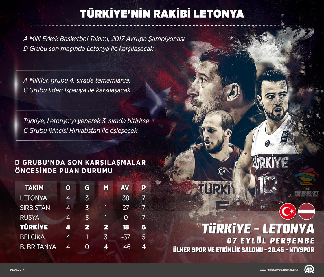2017 Avrupa Basketbol Şampiyonası D Grubu dördüncü müsabakasında Belçika'yı 78-65 yenerek son 16 turuna yükselmeyi garantileyen Türkiye, gruptaki son maçında Letonya ile karşılaşacak. Türkiye'nin gruptaki sıralamasını ve son 16 turunda eşleşeceği rakibini belirleyecek karşılaşma Ülker Spor ve Etkinlik Salonu'nda saat 20.45'te başlayacak.