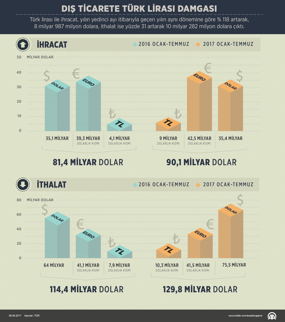 Türk lirası ile yapılan ihracat geçen yıl temmuz ayı itibarıyla 4 milyar 119 milyon dolar iken bu yılın aynı döneminde yüzde 118 artarak 8 milyar 987 milyon dolara ulaştı. İthalatta Türk lirası kullanımı ise bu dönemde geçen yılın aynı dönemine göre yüzde 31 artarak 7 milyar 858 milyon dolardan 10 milyar 282 milyon dolara çıktı ( Gözde Gültekinler - Anadolu Ajansı )06 Eylül 2017•Güncelleme: 06 Eylül 2017