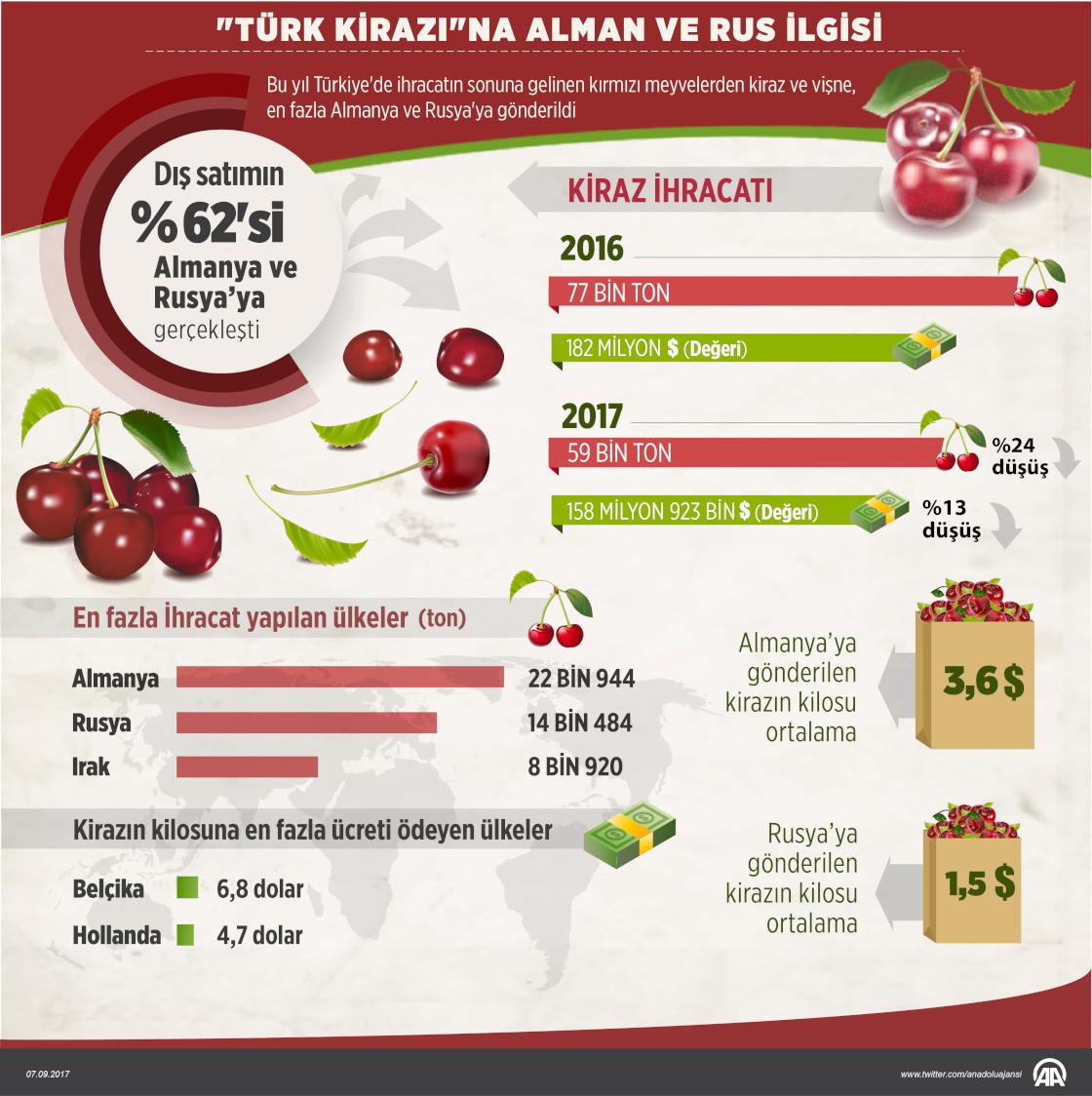 Bu yıl dış satımları tamamlanan kırmızı meyvelerden Türk kirazının yüzde 62'si, vişnenin ise yüzde 65'ini Alman ve Ruslar tüketti. ( Gözde Gültekinler - Anadolu Ajansı )