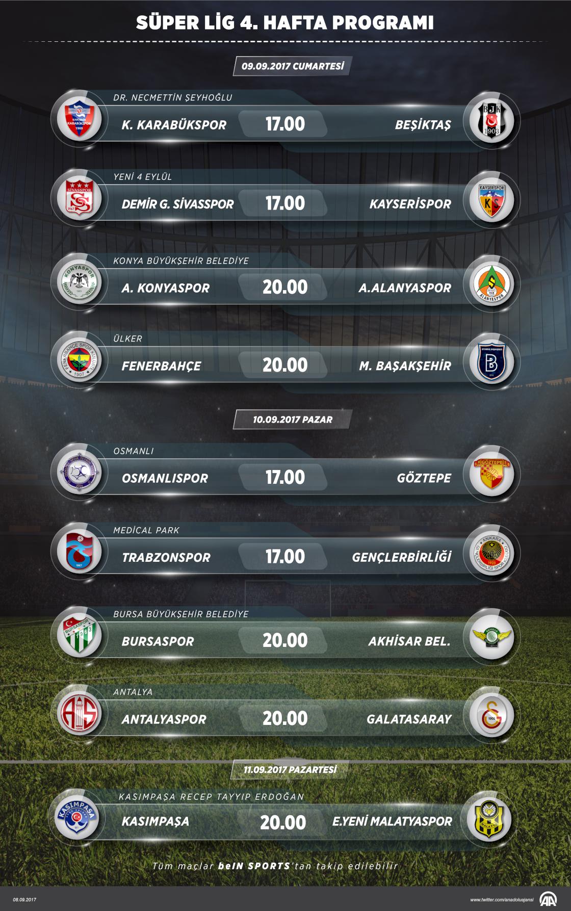 Süper Lig'de 4. haftanın açılış maçında Kardemir Karabükspor ile Beşiktaş karşı karşıya gelecek. Ligde 9 Eylül Cumartesi 4, pazar günü 4 ve pazartesi 1 maç oynanacak. ( Ahmet Burak Özkan - Anadolu Ajansı )