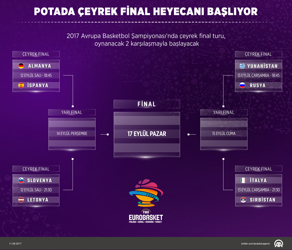 2017 Avrupa Basketbol Şampiyonası'nda çeyrek final turu, yarın oynanacak 2 karşılaşmayla başlayacak. Grup maçlarının ardından Sinan Erdem Spor Salonu'nda devam edilen şampiyonada, yarın çeyrek finalde Almanya-İspanya ve Slovenya-Letonya maçları yapılacak. ( Kemal Delikmen - Anadolu Ajansı )11 Eylül 2017•Güncelleme: 11 Eylül 2017