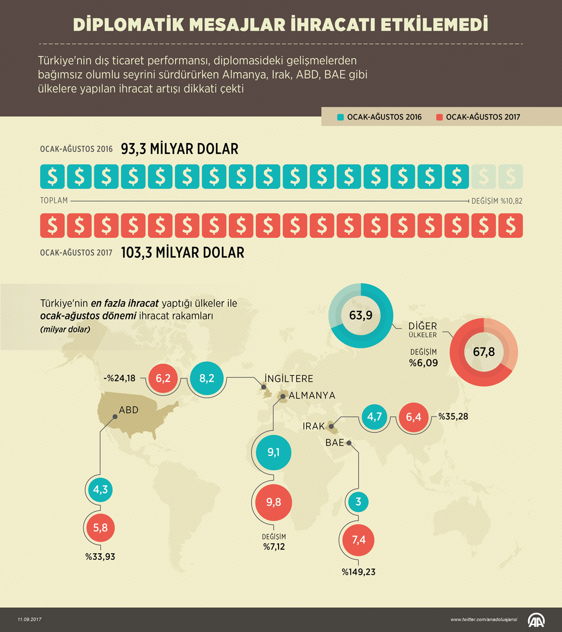 Türkiye İstatistik Kurumu ile Gümrük ve Ticaret Bakanlığı verilerinden derlenen bilgilere göre, Türkiye'nin bu yılın 8 ayındaki ihracatı yüzde 10,82 artışla 103 milyar 348 milyon dolar olarak gerçekleşti. Türkiye'nin dış ticaret performansı, diplomasideki gelişmelerden bağımsız olumlu seyrini sürdürürken Almanya, Irak, ABD, BAE gibi ülkelere yapılan ihracat artışı dikkati çekti. Son dönemde siyasi gerginliğin yaşandığı Almanya'ya ihracat 8 ayda geçen yılın aynı dönemine göre yüzde 7,12 artışla 9,8 milyar dolara ulaştı. BAE'ye ihracat ise aynı dönemde yüzde 149,2 artış gösterdi. ( Ahmet Burak Özkan - Anadolu Ajansı )11 Eylül 2017•Güncelleme: 11 Eylül 2017