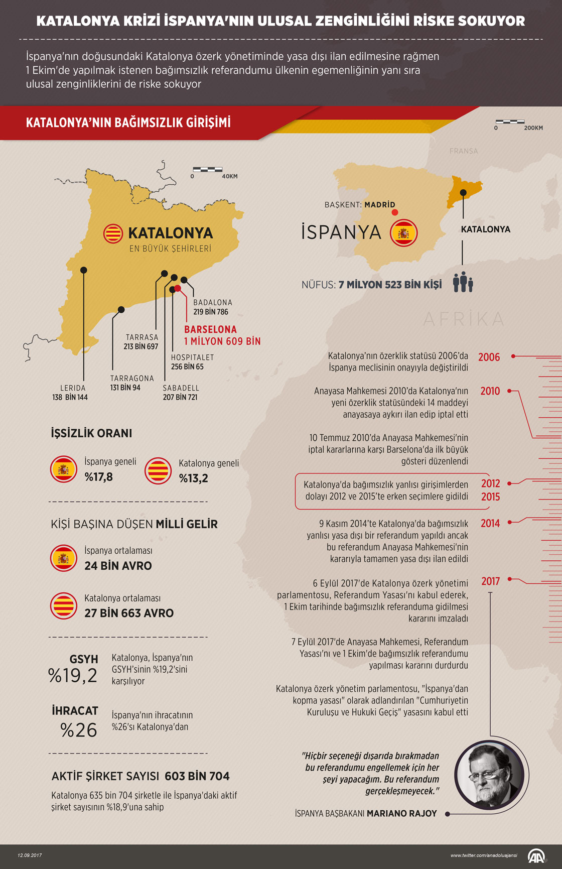 İspanya'nın doğusundaki Katalonya özerk yönetiminde, "yasa dışı" ilan edilmesine rağmen 1 Ekim'de yapılmak istenen bağımsızlık referandumu ülkenin egemenliğinin yanı sıra ulusal zenginliklerini de riske sokuyor. İspanya'nın GSYH'sinin yüzde 19,2'sini karşılayan Katalonya'nın bağımsızlık girişimleri, ülkenin ulusal zenginliğine risk oluşturuyor. İspanya'da kişi başına düşen yıllık milli gelir 24 bin avro civarında iken Katalonya'da bu rakam 27 bin avroyu buluyor. Grafik: AA/Ahmet Burak Özkan12 Eylül 2017•Güncelleme: 12 Eylül 2017