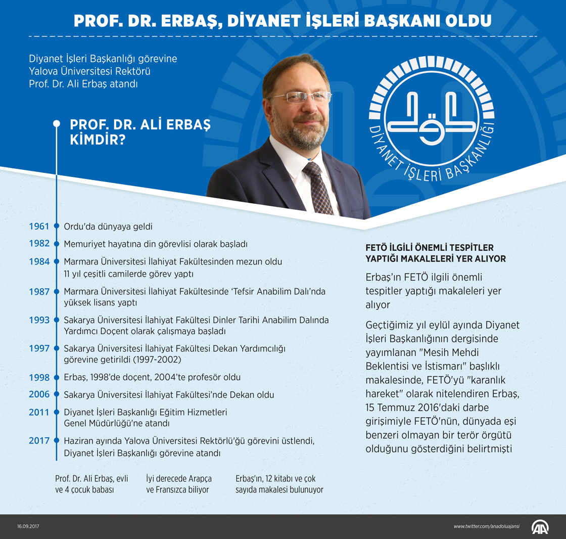 Diyanet İşleri Başkanlığına, Yalova Üniversitesi Rektörü Prof. Dr. Ali Erbaş atandı.