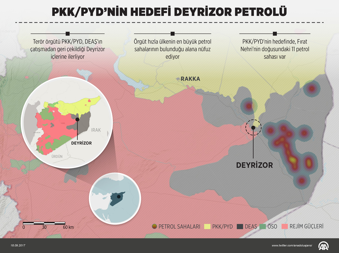 Terör örgütü PKK/PYD, Suriye’nin en verimli petrol sahalarının yer aldığı Deyrizor ili içlerine hızla ilerliyor. Terör örgütü DEAŞ'ın çatışmadan çekildiği Irak sınırındaki alanda 11 önemli petrol yatağı bulunuyor.