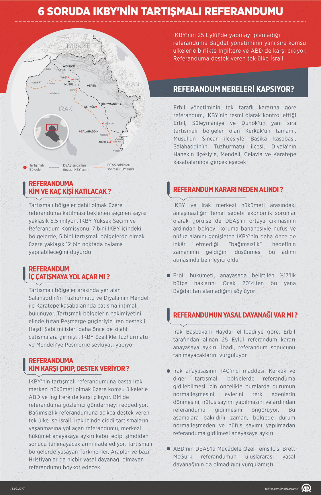 IKBY'nin 25 Eylül'de yapmayı planladığı referanduma Bağdat yönetiminin yanı sıra komşu ülkelerle birlikte İngiltere ve ABD de karşı çıkıyor. Referanduma destek veren tek ülke İsrail.