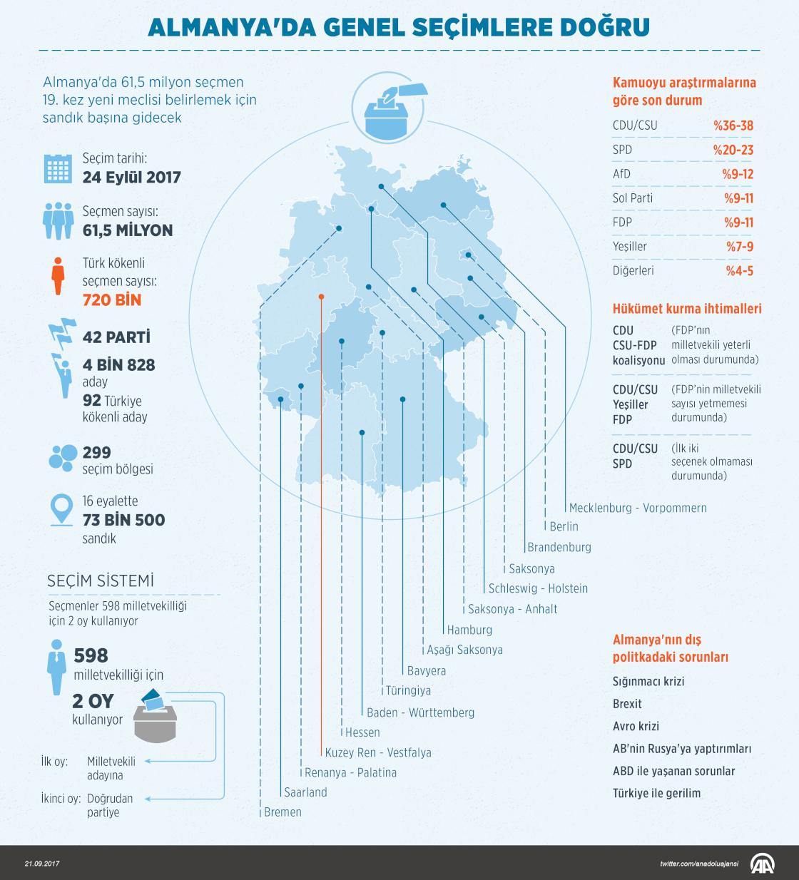 Almanya'da pazar günü yapılacak genel seçimler, Başbakan Angela Merkel liderliğinde farklı koalisyon ihtimallerini ortaya çıkarırken, aşırı sağcı Almanya için Alternatif (AfD) partisinin mecliste üçüncü büyük parti olması olasılığı da dikkati çekiyor. Kamuoyu araştırmalarında, CDU/CSU'nun yüzde 36-38, SPD'nin yüzde 20-23, AfD'nin yüzde 9-12, Sol Parti ve FDP'nin yüzde 9-11, Yeşiller'in yüzde 7-9 ve diğerlerinin de yüzde 4-5 oranında oy alabileceği değerlendiriliyor. ( Yasin Demirci - Anadolu Ajansı )21 Eylül 2017•Güncelleme: 21 Eylül 2017
