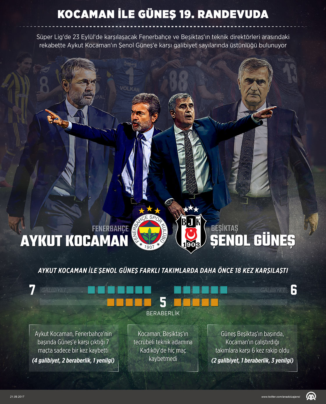 Süper Lig'de 23 Eylül'de karşılaşacak Fenerbahçe ve Beşiktaş'ın teknik direktörleri arasındaki rekabette, Aykut Kocaman'ın Şenol Güneş'e karşı galibiyet sayısında 1 maç üstünlüğü bulunuyor.