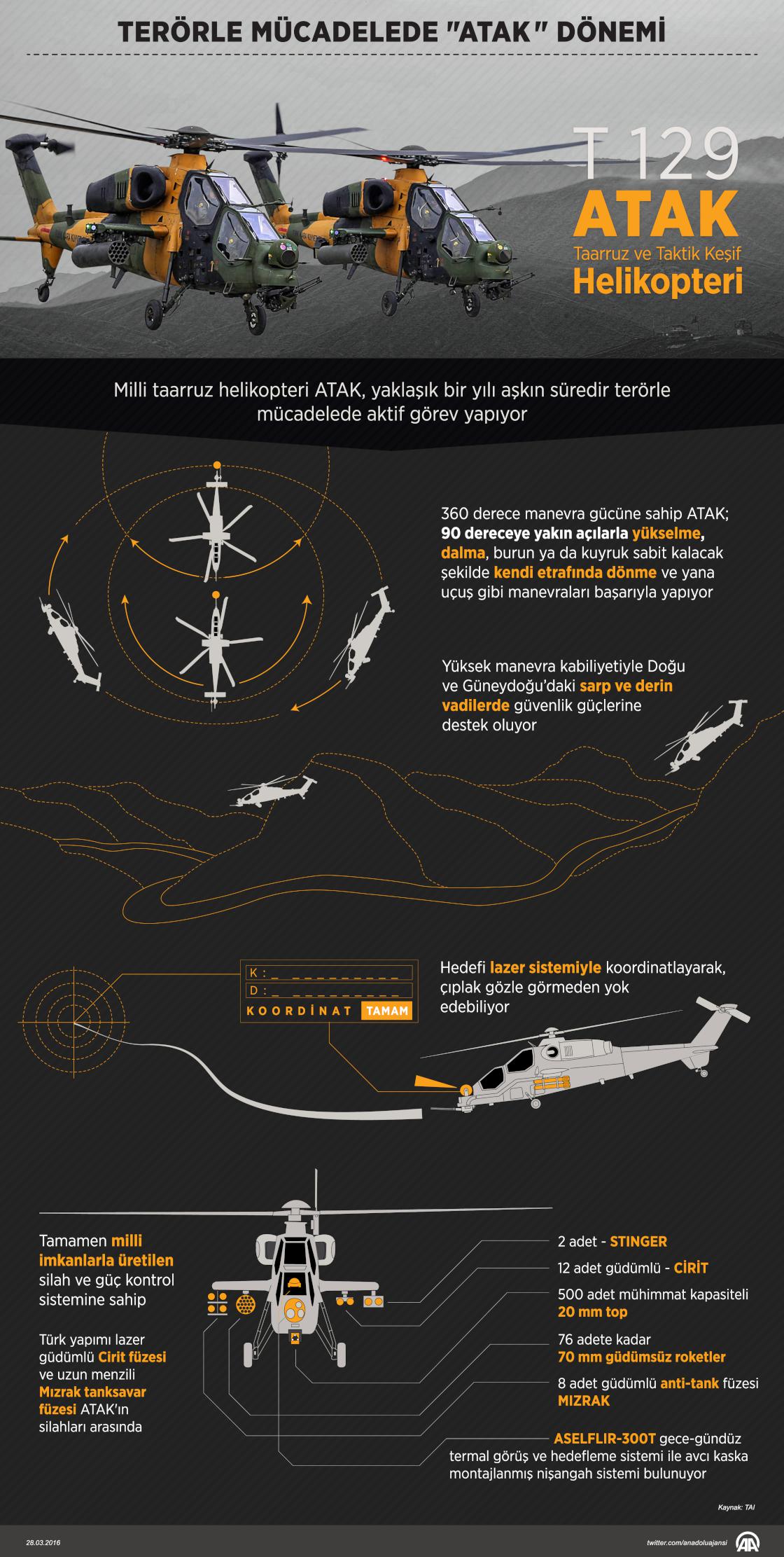 Yüksek manevra kabiliyeti, yeni nesil hedef tespit sistemi, etkin ve özgün silah teknolojisiyle Türk Silahlı Kuvvetlerinin (TSK) gücüne güç katan milli taarruz helikopteri ATAK, son bir yıldır terörle mücadele operasyonlarının sürdürüldüğü bölgelerde aktif görev yapıyor. ( Murat Usubaliev - Anadolu Ajansı )28 Mart 2016•Güncelleme: 29 Mart 2016