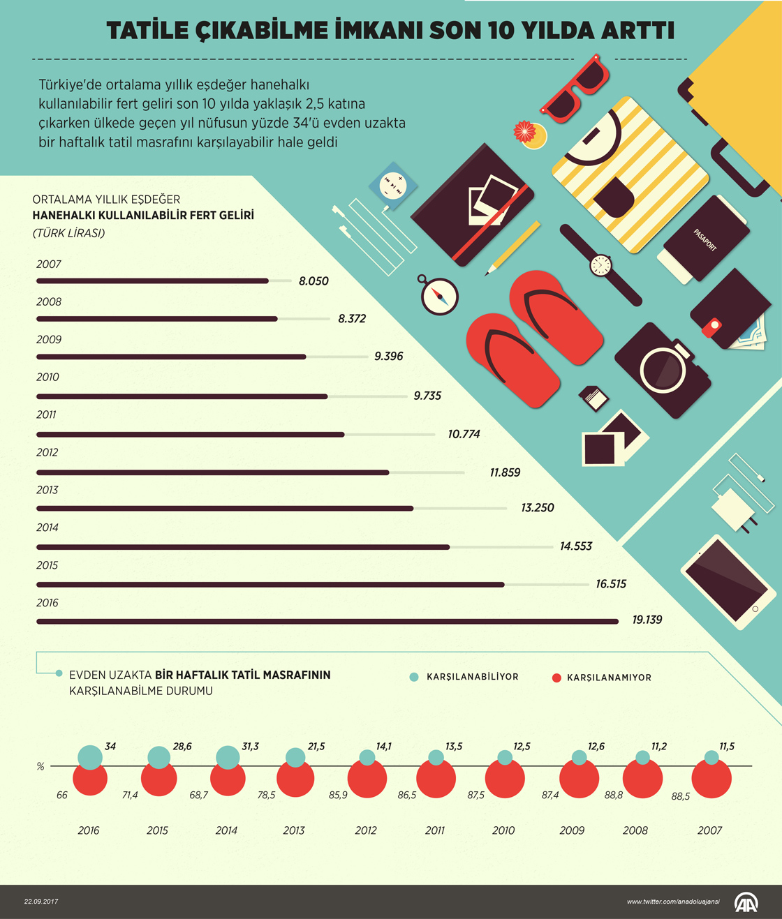 Türkiye'de ortalama yıllık eşdeğer hanehalkı kullanılabilir fert geliri son 10 yılda yaklaşık 2,5 katına çıkarken, nüfusun yüzde 34'ü geçen yıl itibarıyla evden uzakta bir haftalık tatil masrafını karşılayabilir hale geldi.
