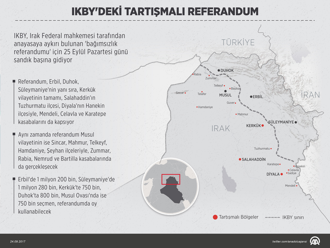 Irak Kürt Bölgesel Yönetimi'nin (IKBY) aldığı ve Irak Federal mahkemesi tarafından 'anayasaya aykırı' bulunan sözde 'bağımsızlık referandumu' için seçmen 25 Eylül Pazartesi günü sandık başına gidiyor. ( Muhammed Ali Yiğit - Anadolu Ajansı )