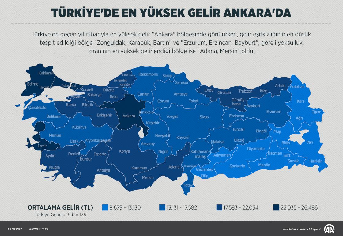 Türkiye İstatistik Kurumu (TÜİK), 2016 yılı gelir ve yaşam koşulları araştırması bölgesel sonuçlarını açıkladı. Türkiye'de geçen yıl itibarıyla en yüksek gelir "Ankara" bölgesinde görülürken, gelir eşitsizliğinin en düşük tespit edildiği bölge "Zonguldak, Karabük, Bartın" ve "Erzurum, Erzincan, Bayburt", göreli yoksulluk oranının en yüksek belirlendiği bölge ise "Adana, Mersin" oldu.