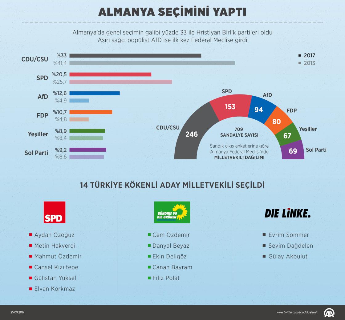 Almanya’da genel seçimin galibi yüzde 33 ile Hristiyan Birlik partileri oldu Aşırı sağcı popülist AfD ise ilk kez Federal Meclise girdi. Geçen seçimde 11 olan Türk kökenli milletvekili sayısı bu seçim sonrası 14'e yükseldi.
