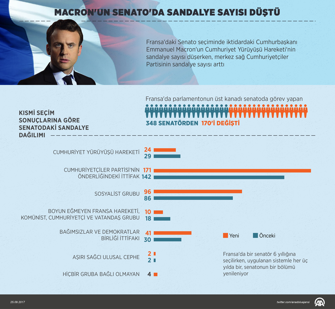 Fransa'daki Senato seçiminde iktidardaki Cumhurbaşkanı Emmanuel Macron'un Cumhuriyet Yürüyüşü Hareketi'nin sandalye sayısı düşerken, merkez sağ Cumhuriyetçiler Partisinin sandalye sayısı arttı. ( Murat Usubaliev - Anadolu Ajansı )