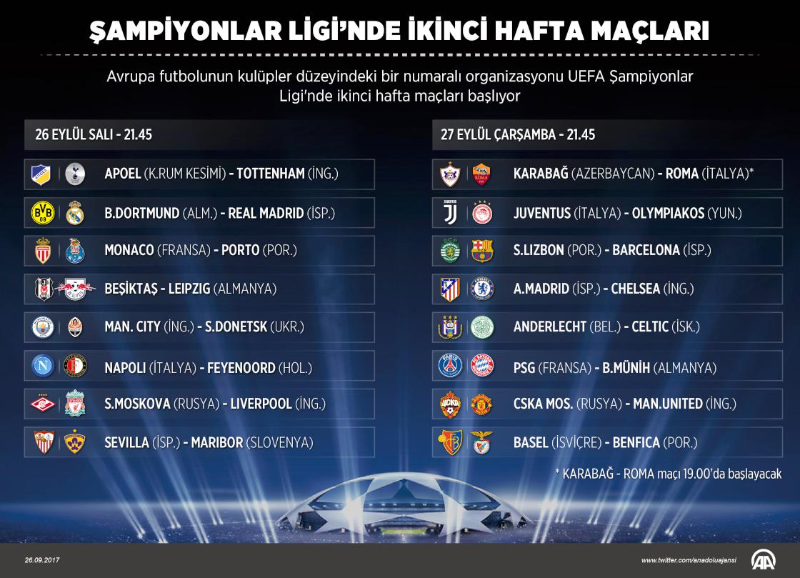Avrupa futbolunun kulüpler düzeyindeki bir numaralı organizasyonu UEFA Şampiyonlar Ligi'nde ikinci hafta maçları bugün başlıyor. Türkiye'nin Şampiyonlar Ligi'ndeki tek temsilcisi Beşiktaş, G Grubu'ndaki ikinci maçında, bugün saat 21.45'te Almanya'nın Leipzig takımını konuk edecek.