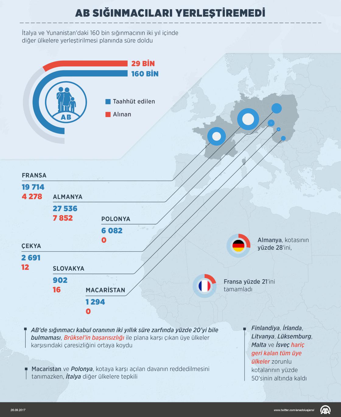 Avrupa Birliği'nin (AB) İtalya ve Yunanistan'daki 160 bin sığınmacıyı zorunlu kota sistemiyle üye ülkelere yerleştirme planı bugün sona ererken, sadece 29 bin sığınmacının yerleştirilmesi, AB'nin başarısızlığı ile dayanışma eksikliğini ortaya koydu. Plan kapsamında sadece 29 bin sığınmacı diğer ülkelere yerleştirilebildi. Macaristan ve Polonya plan kapsamında tek bir kişiyi bile kabul etmezken, Çekya 12, Slovakya da 16 sığınmacı aldı. Almanya, kotasının yüzde 28'ini, Fransa da yüzde 21'ini tamamladı. ( Ahmet Burak Özkan - Anadolu Ajansı )26 Eylül 2017•Güncelleme: 26 Eylül 2017