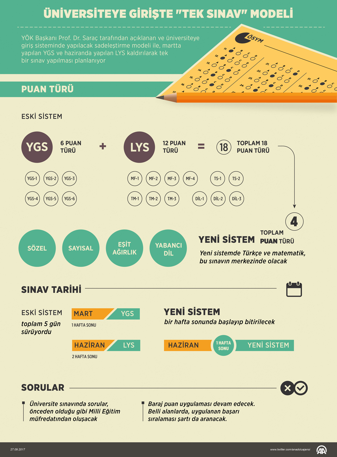 Yükseköğretim Kurulu (YÖK) Başkanı Prof. Dr. Yekta Saraç tarafından açıklanan üniversiteye giriş sisteminde sadeleştirme modeliyle, marttaki Yükseköğretime Geçiş Sınavı (YGS) ve hazirandaki Lisans Yerleştirme Sınavları'nın (LYS) kaldırılarak, haziranda bir hafta sonu tek sınav uygulanması planlanıyor. ( Ahmet Burak Özkan - Anadolu Ajansı )27 Eylül 2017•Güncelleme: 27 Eylül 2017