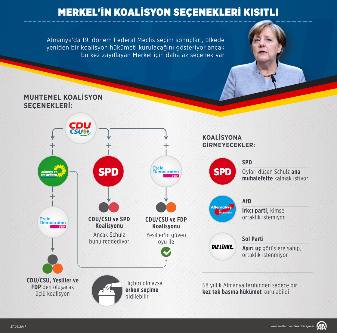 İkinci Dünya Savaşı'nın ardından 1949 yılında kurulan Almanya, koalisyon ülkesi olmaktan kurtulamıyor. Almanya'nın 68 yıllık siyasi tarihinde sadece bir kez, o da 1957 yılında tek başına iktidara gelen Hristiyan Birlik partilerinin (CDU/CSU) dışında bugüne kadar tek başına iktidara gelen başka bir parti olmadı. ( Murat Usubaliev - Anadolu Ajansı )27 Eylül 2017•Güncelleme: 27 Eylül 2017